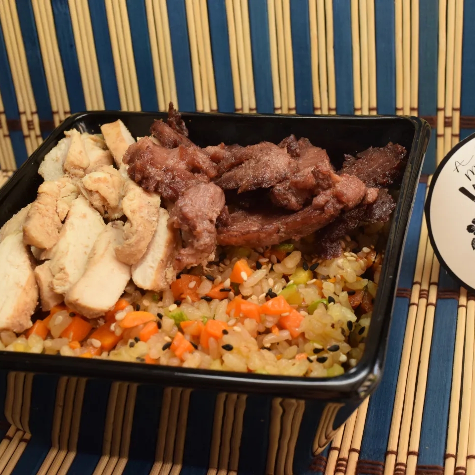 Mix de ingredientes (brócoli, calabaza, zanahoria, pimiento, champiñón y cebolla) salteadas en salsa teriyaki con una porción de arroz blanco y arrachera, pollo y camarón.