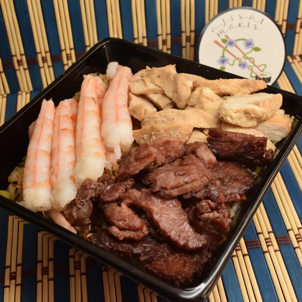 Doble porción de arroz, arrachera, pollo, camarón, Philadelphia, manchego, pepino y aguacate encima.