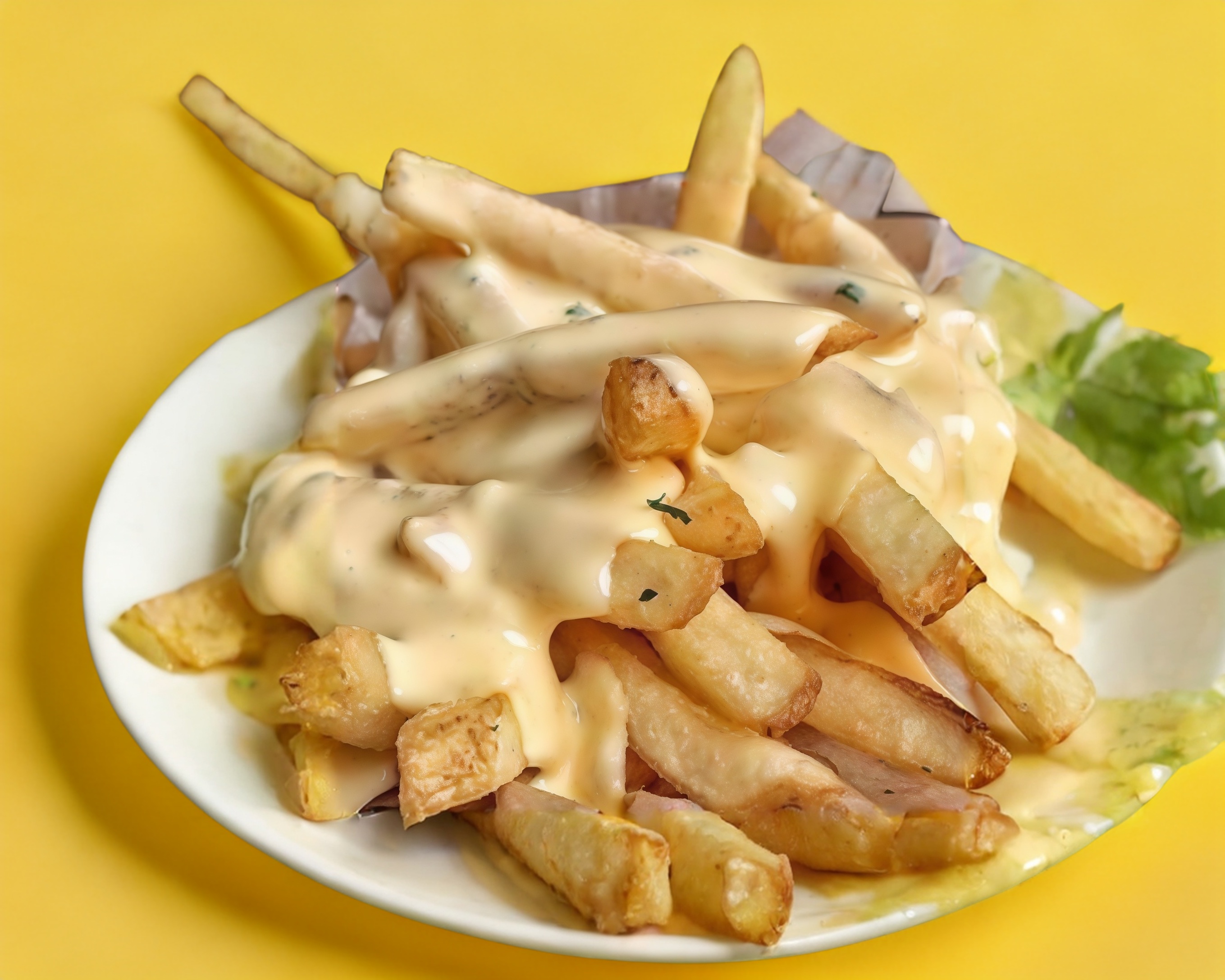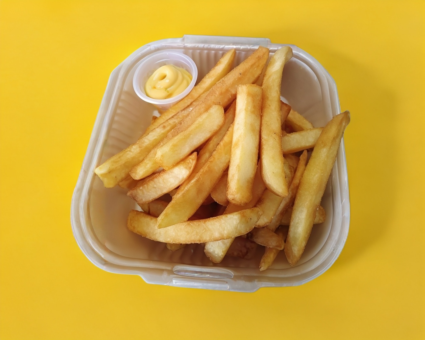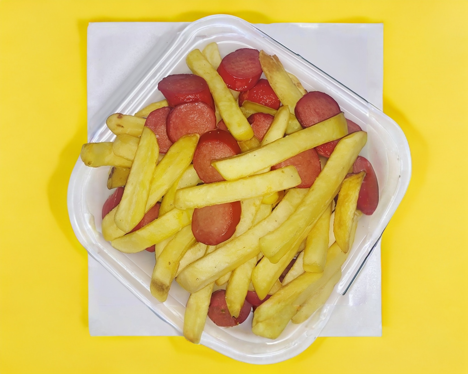 Salchichas fritas con papas a la francesa ,crema ,capsu,salsa valentina