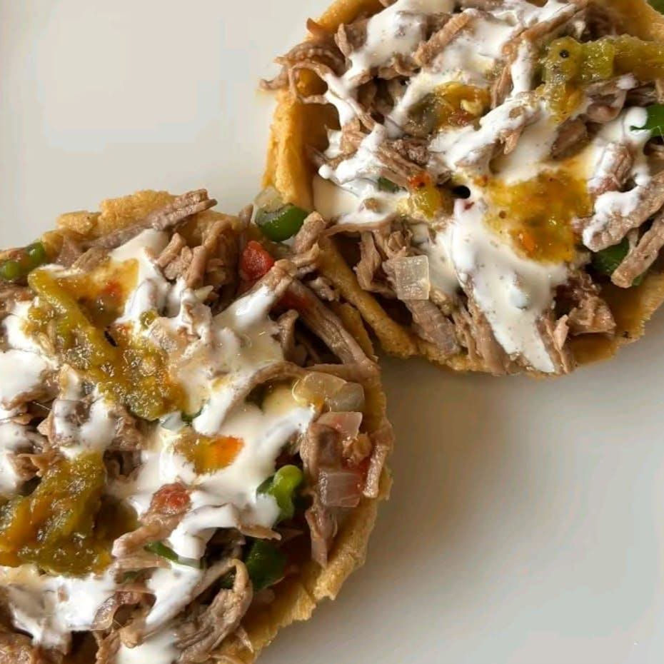 Tortilla de harina,queso oaxaca ,carne desebrada,lechuga,jitomate,cebolla,salsa