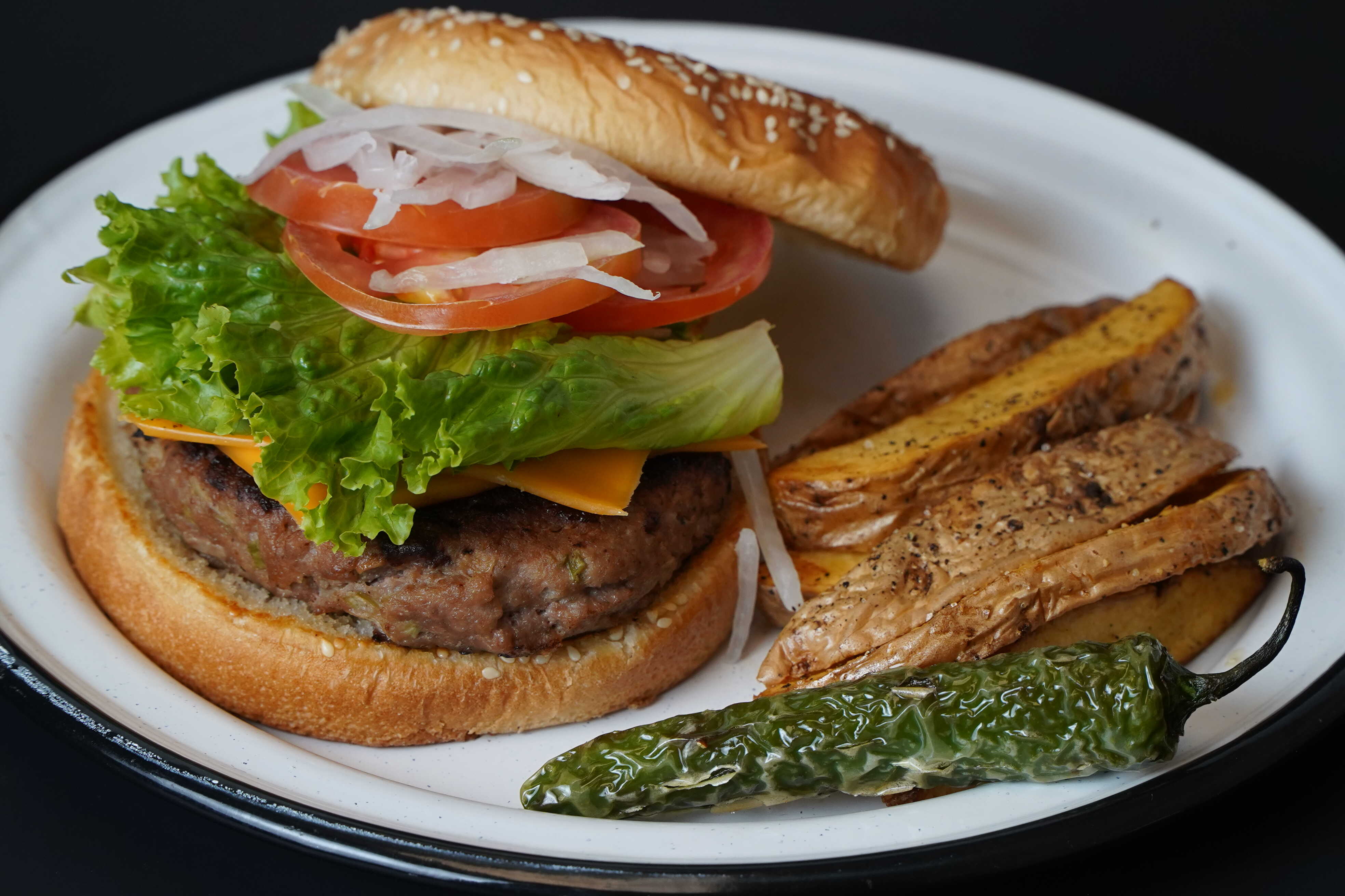 200gr de carne de res con dos rebanadas de queso americano sobre una cama de lechuga, jitomate y cebolla; cuenta con papas a la francesa y chile toreado.