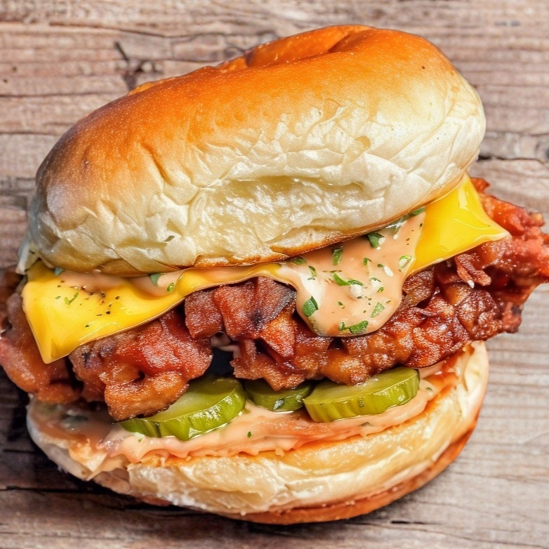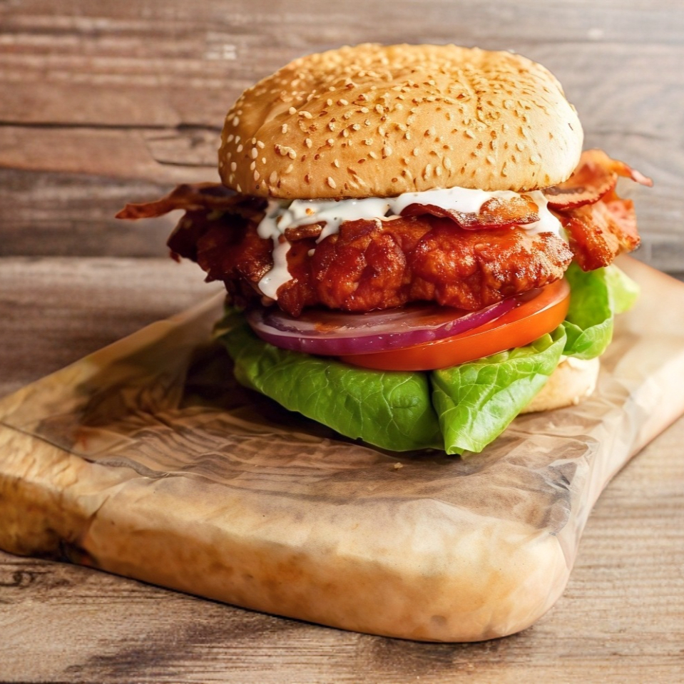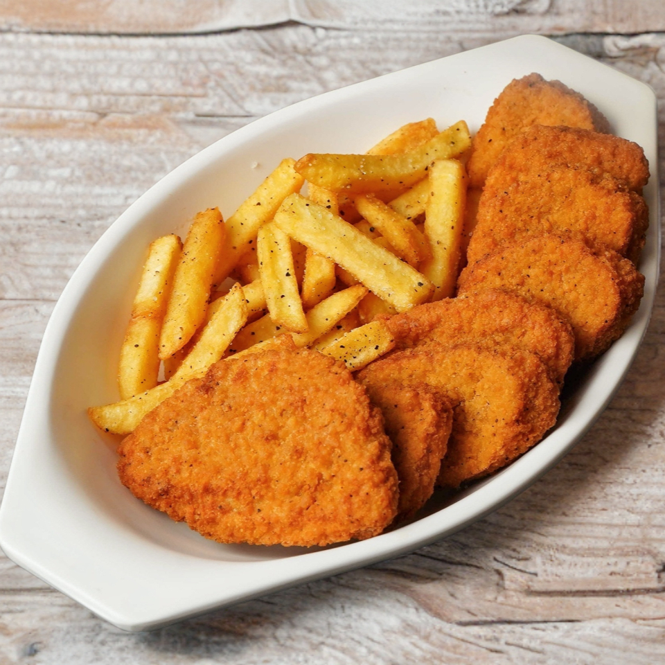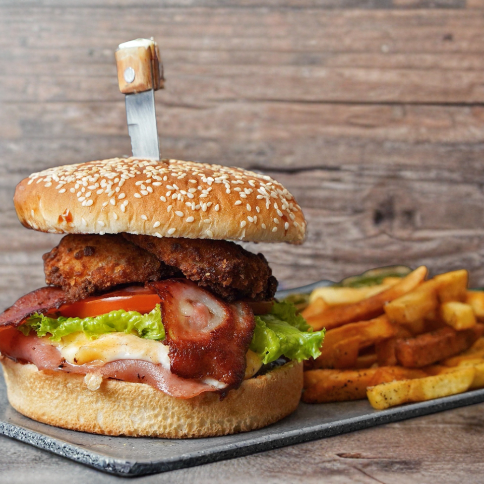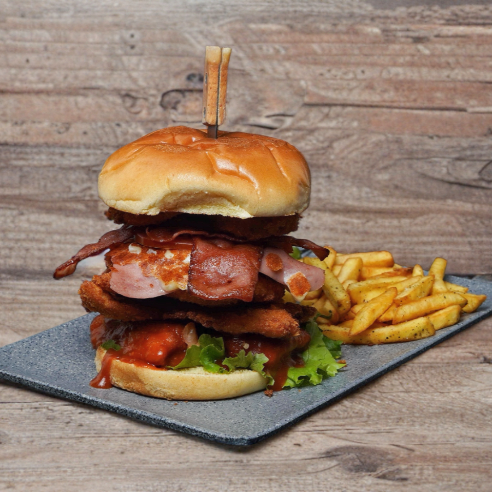 Elaborada con pollo empanizado 200gr, una generosa porción de 3 quesos, aros de cebolla, tocino y verduras, incluye papas a la francesa