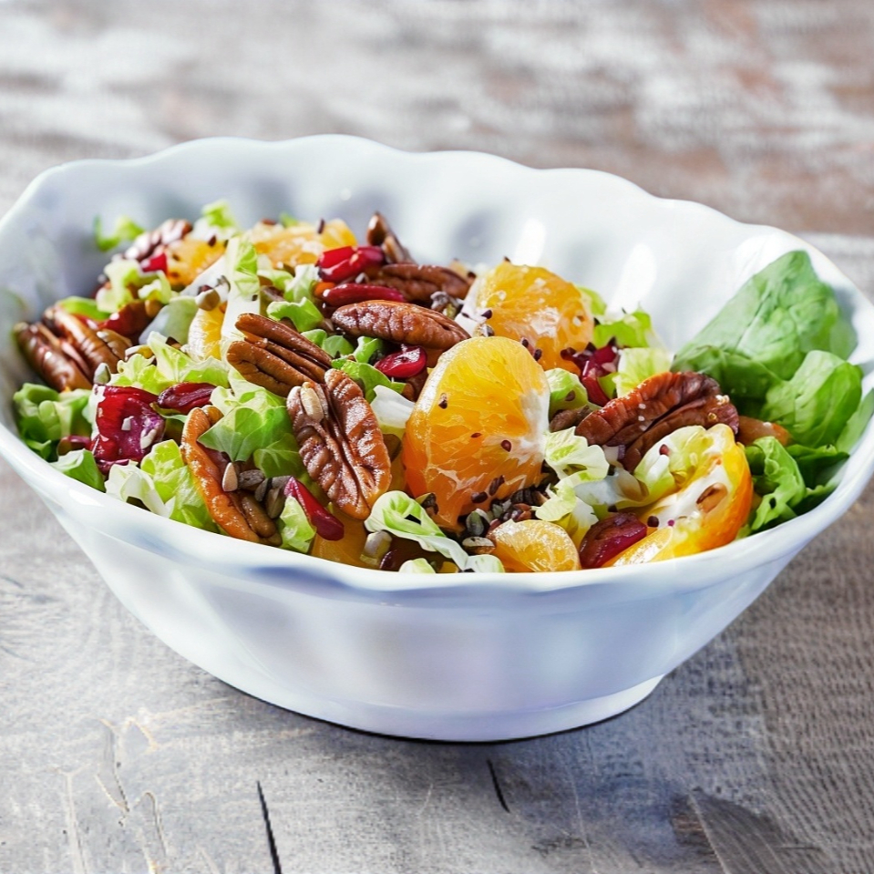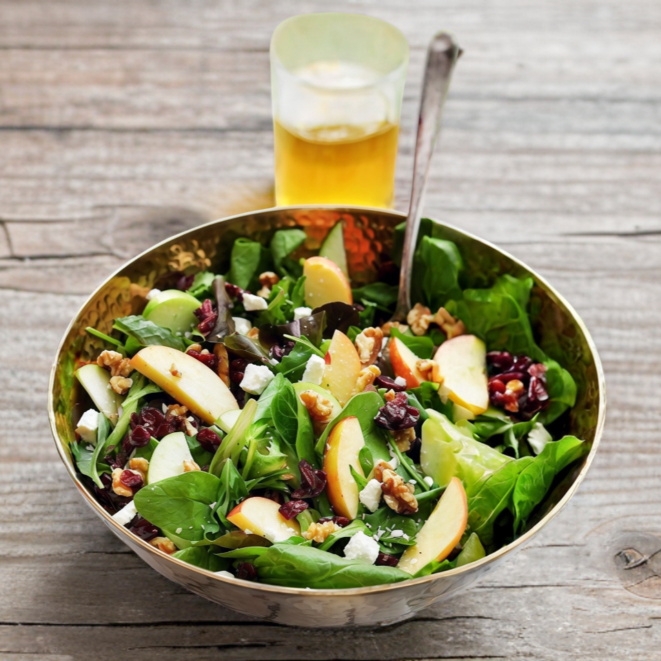 Tiernas lechugas mezcladas con queso panela, arándanos, Nuez, Almendra y nuestro tradicional aderezo de la casa.