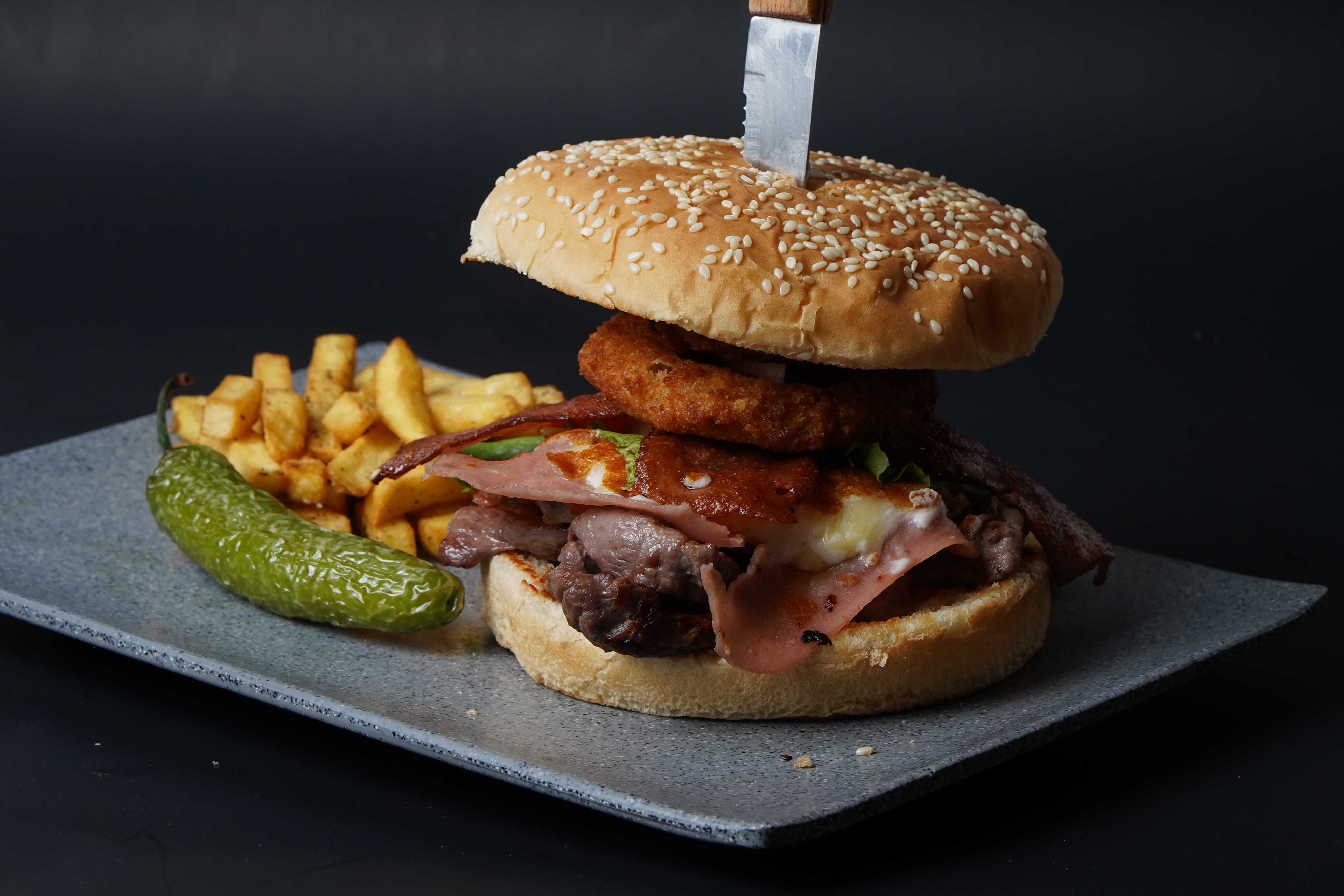Elaborada con carne de res a la parrilla (200gr), tocino, aros de cebolla, 3 quesos y verduras incluye papas a la francesa
