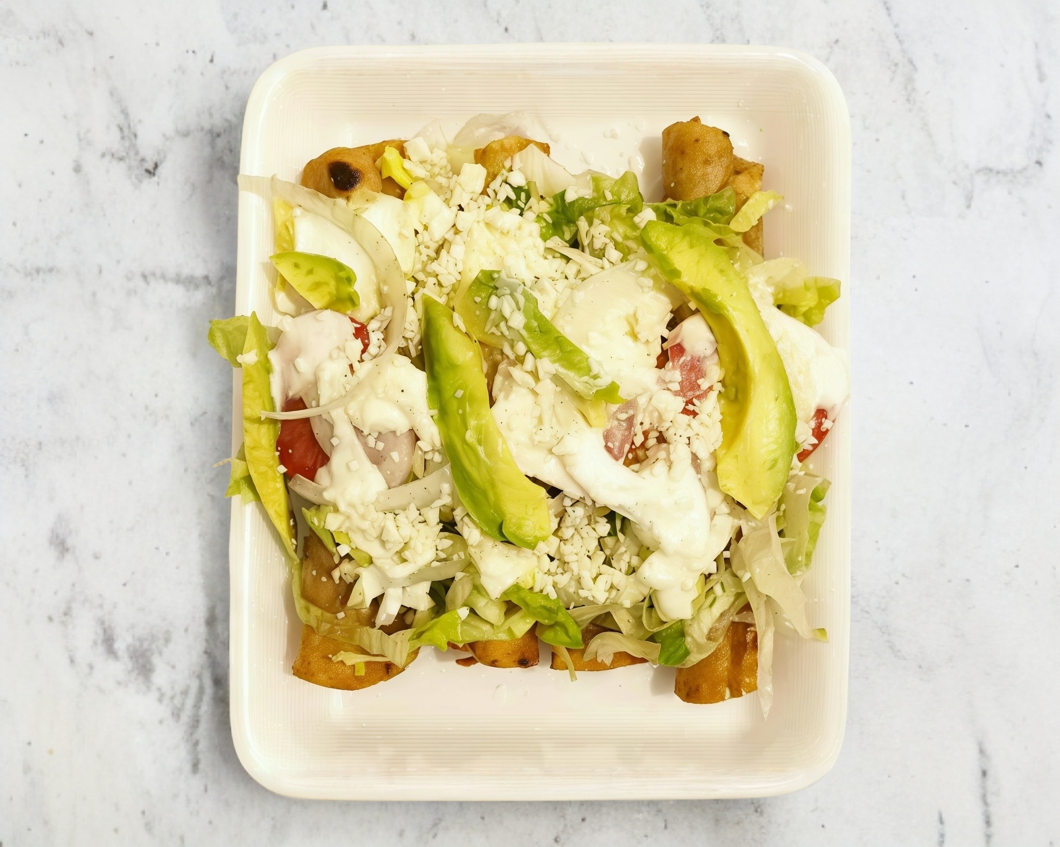 Tortilla de maíz dorada con papa, lechuga, jitomate, queso,crema y salsa