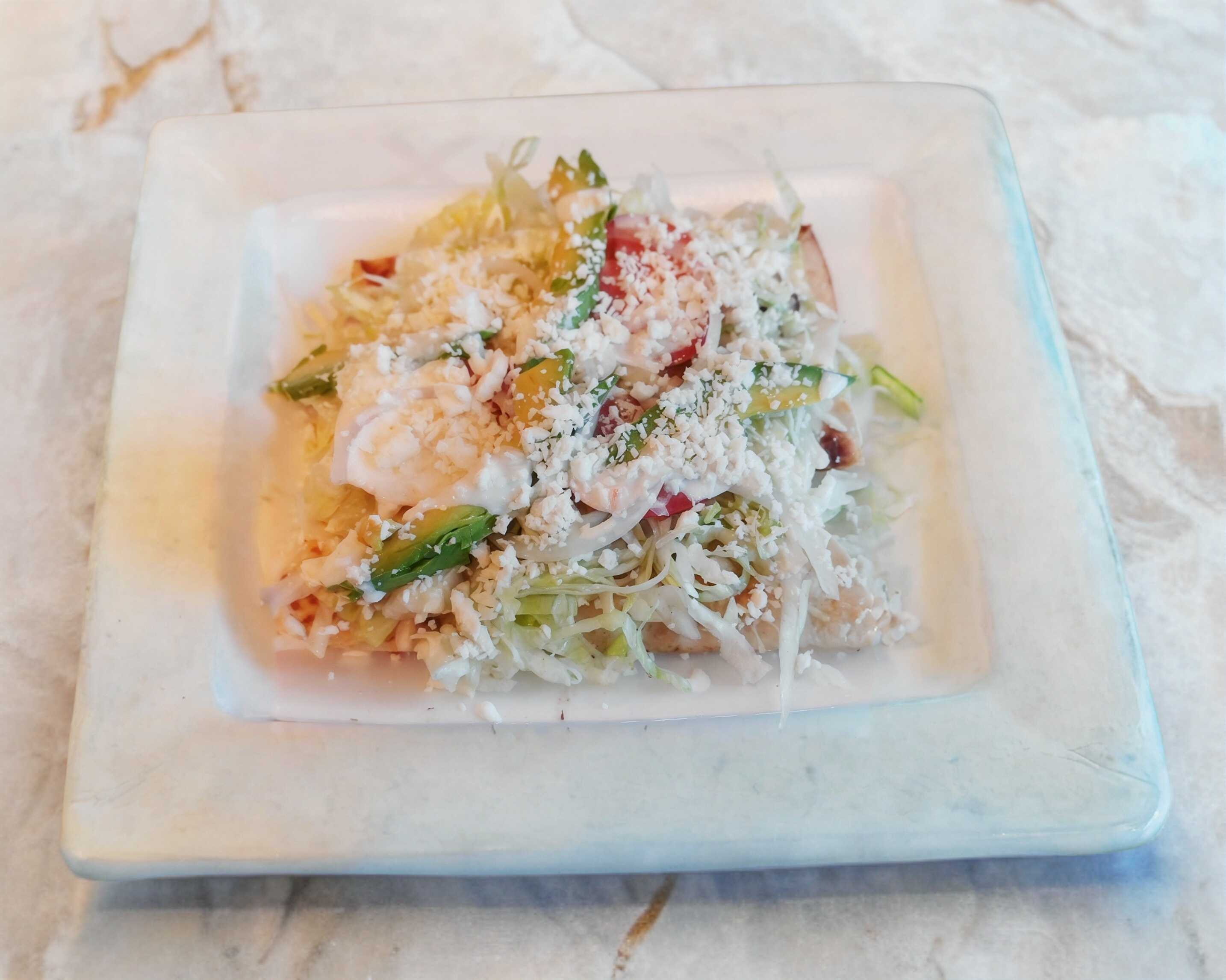 Tortilla de maíz dorada con pollo, lechuga, jitomate, queso, crema y salsa