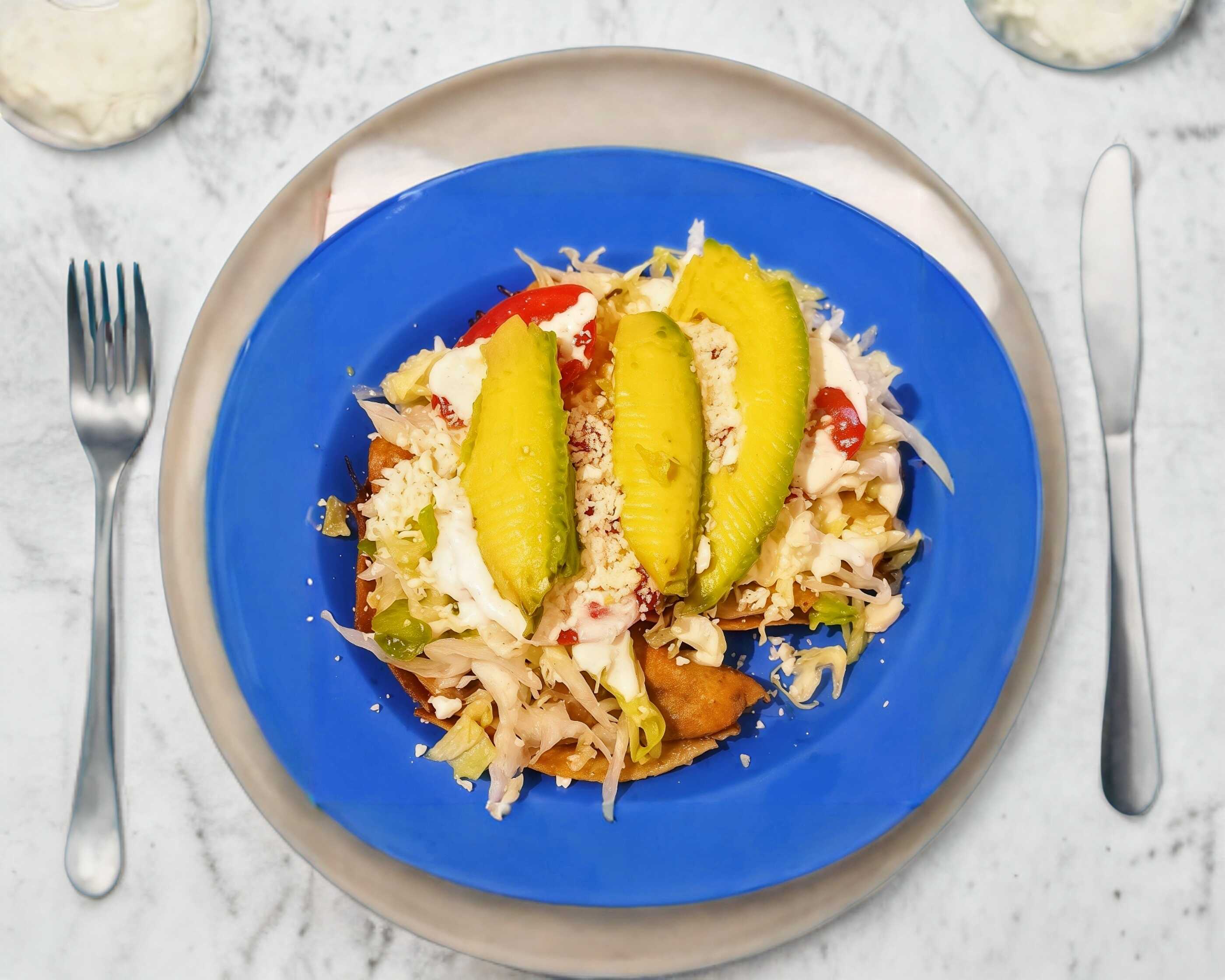 Tortilla de maíz dorada con desebrada,rajas, lechuga, jitomate, queso,crema y salsa