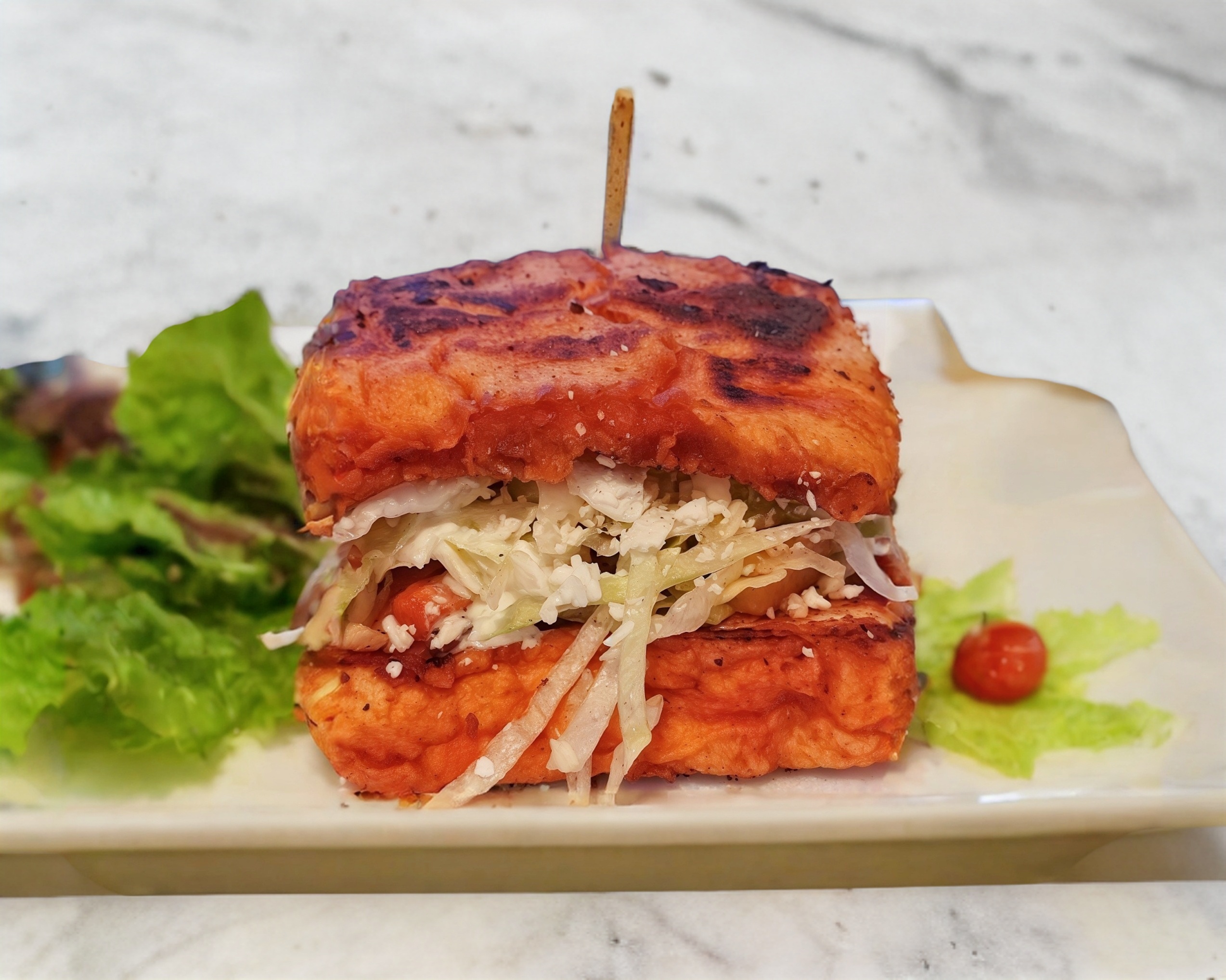 Pan bañado en Chile guajillo guisado relleno de chorizo verdura queso crema y lechuga fresca