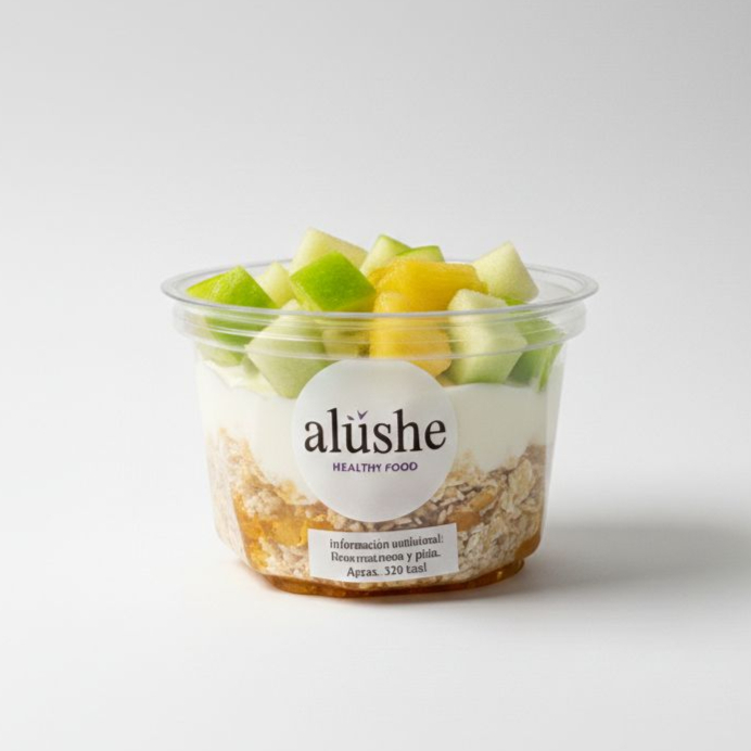 15G DE PROTEINA, Avena trasnochada 12 hrs, jarabe de maple sin azucar, coco rayado, manzana verde y piña(temporada)), yogurt griegoextracremoso y queso cottage lght