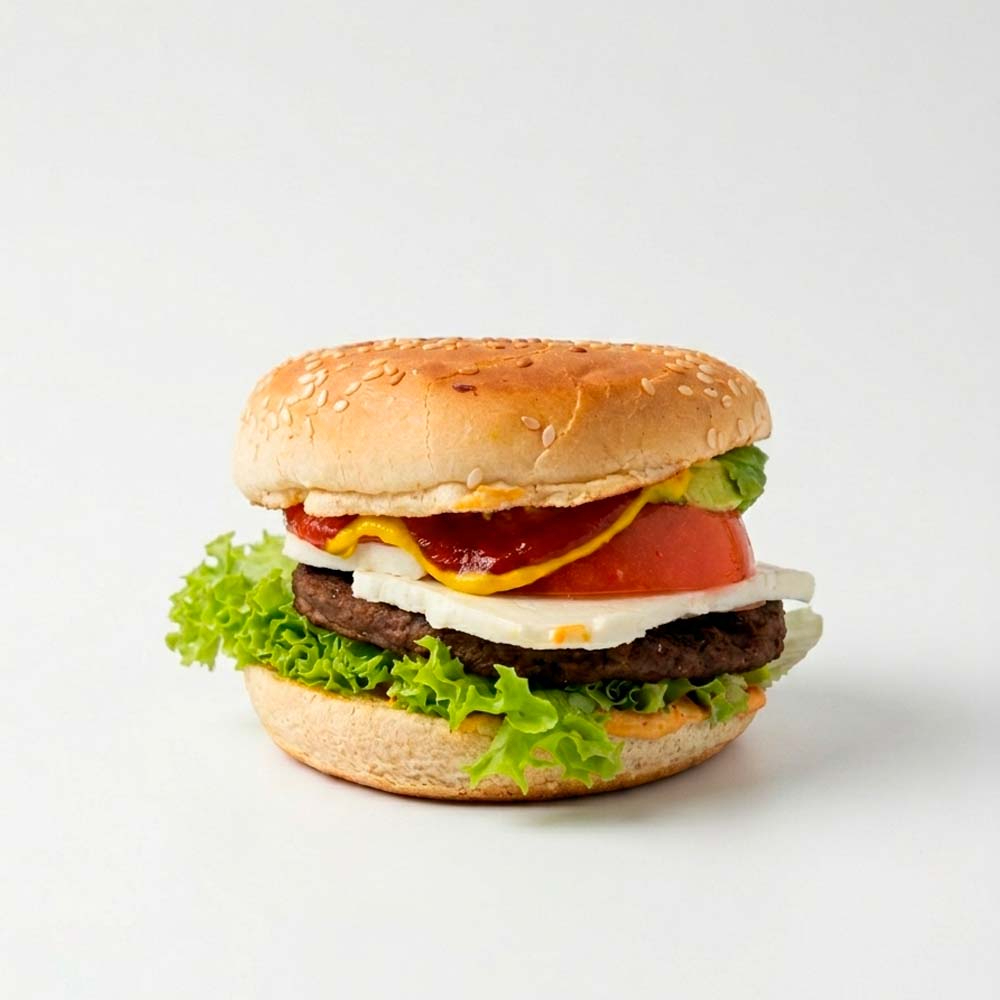 hamburguesa con carne 95%, panela bajo en sodio, jamon 100% pavo, catsup sin azucar, mostaza, mayonesa light, jitomate, lechuga hidroponica y aguacate