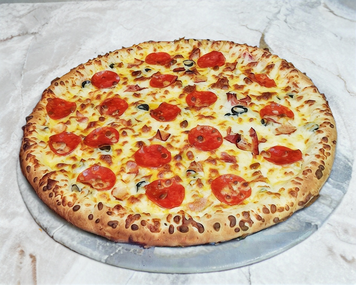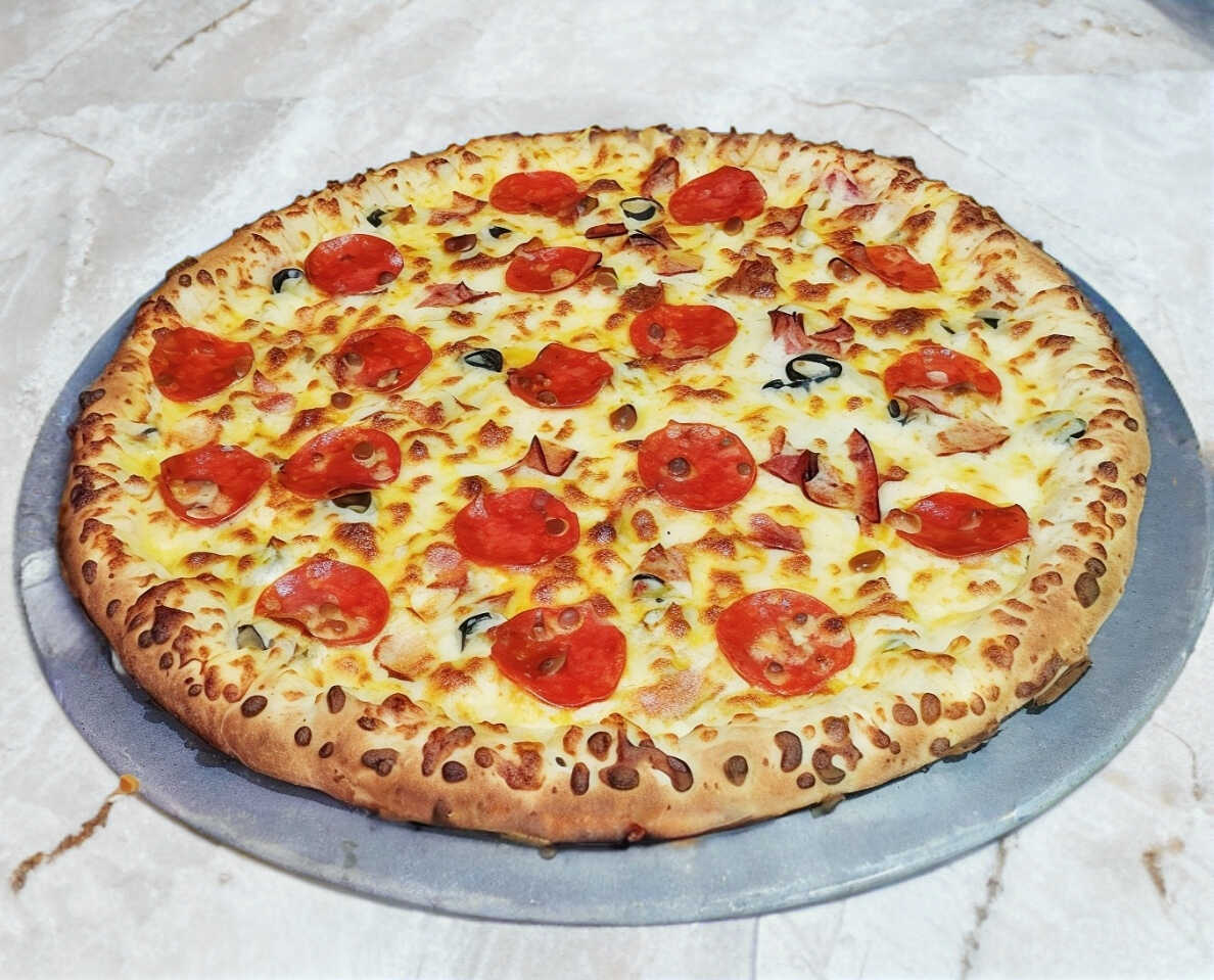 Salami, champiñones, pepperoni, tocino y aceituna negra.