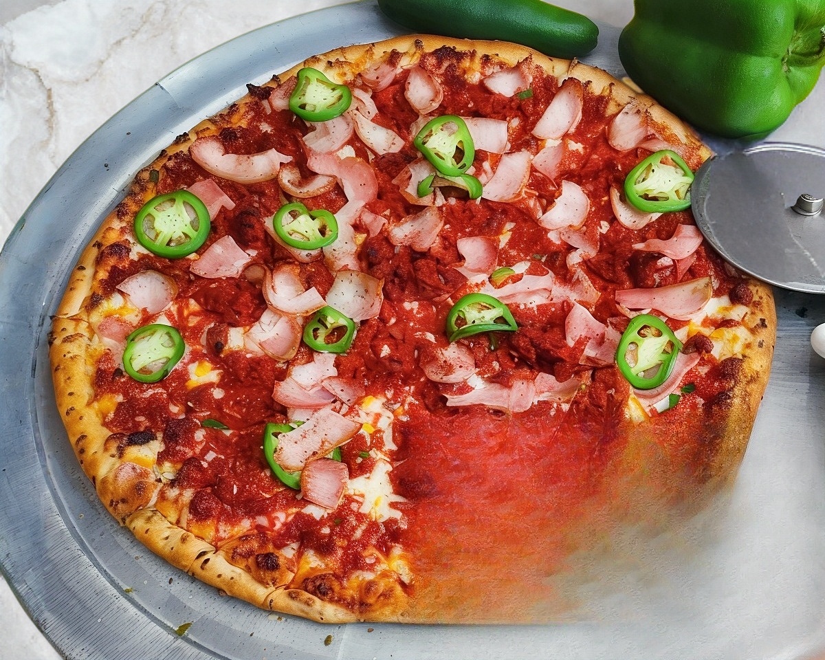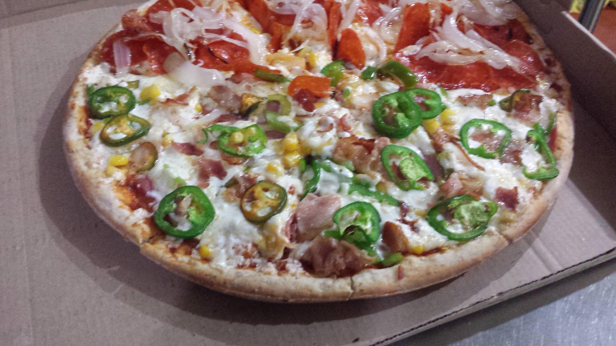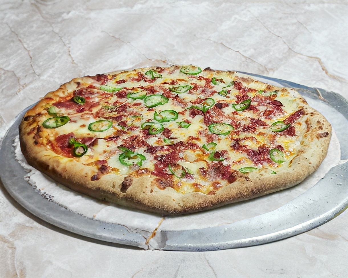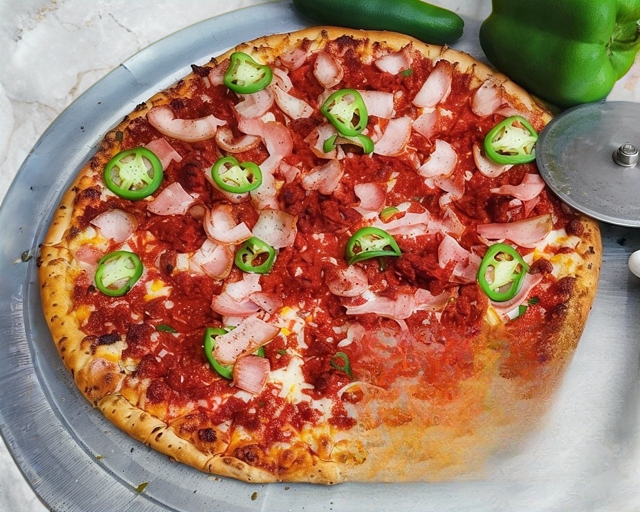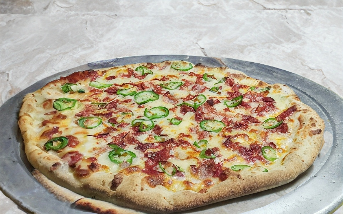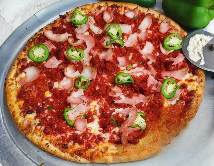 Pimiento, cebolla, chorizo, tocino y jalapeño.