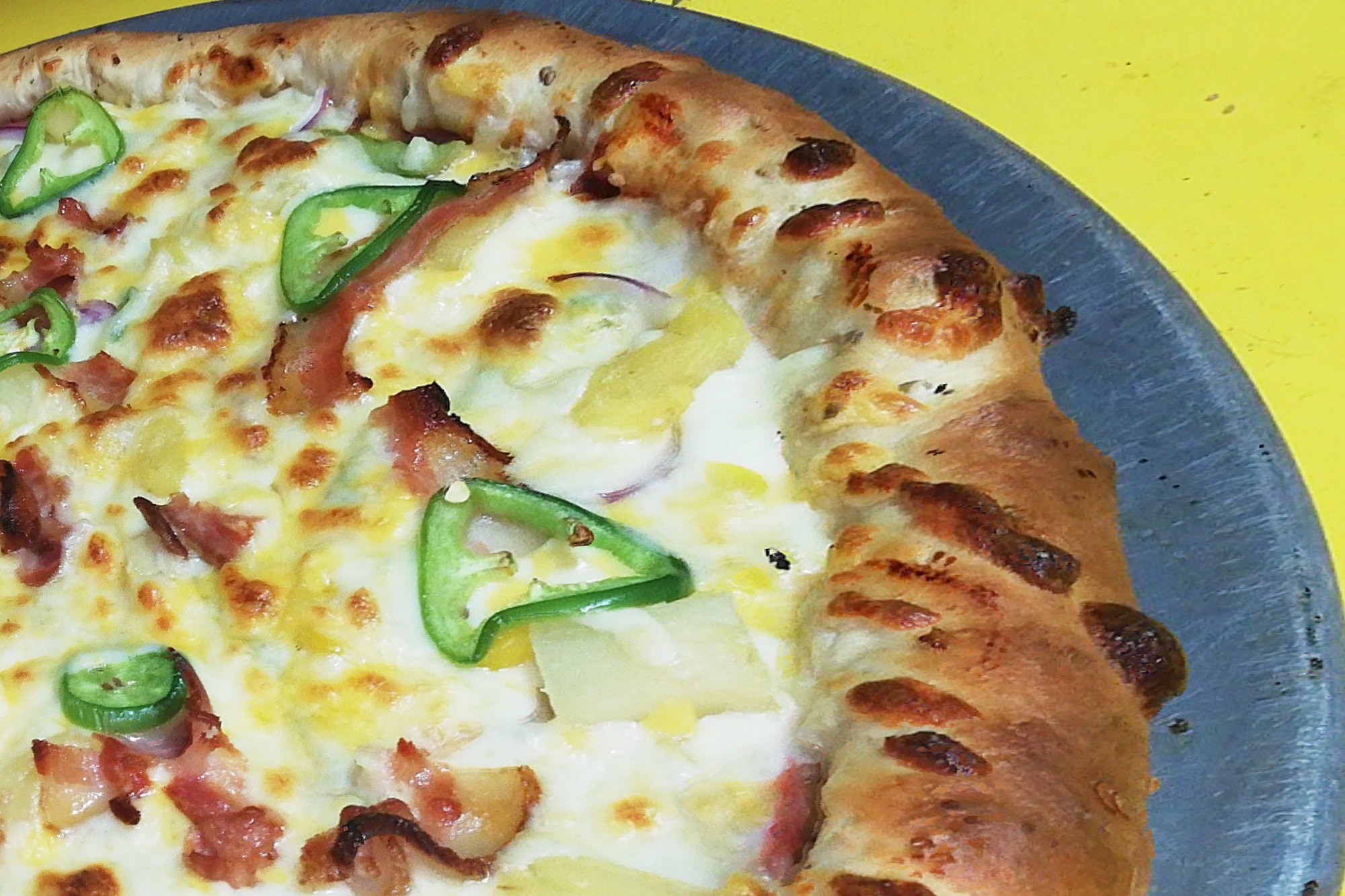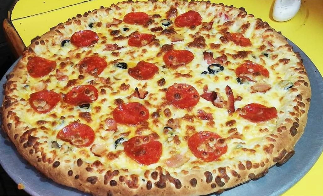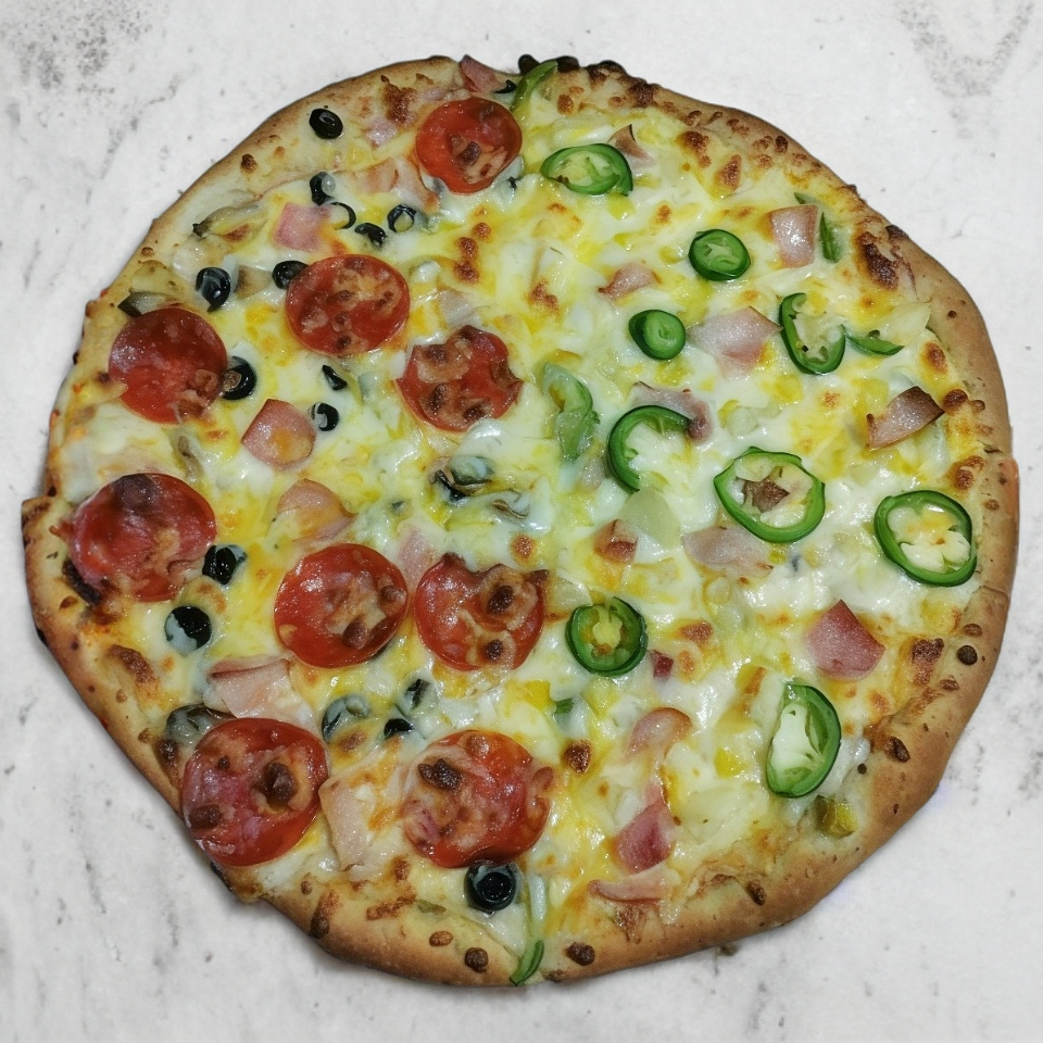Salami, pimiento, cebolla, piña, elote, jalapeño y tocino.