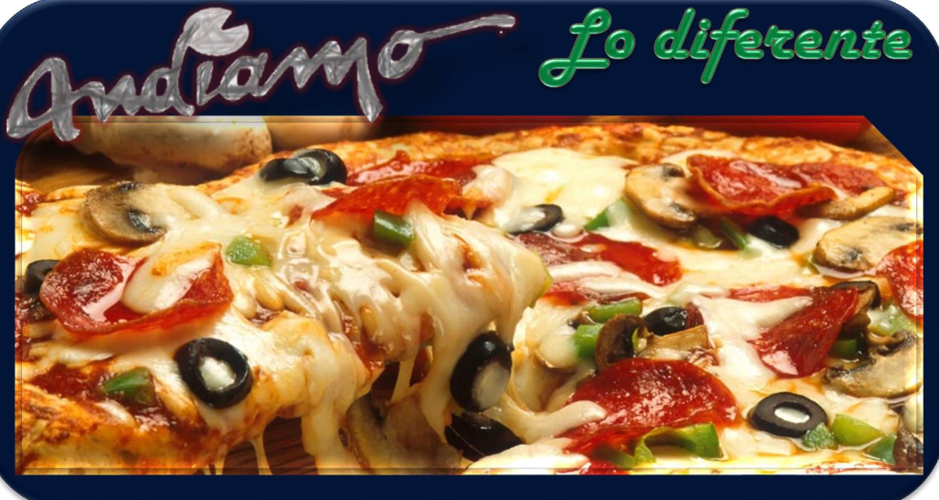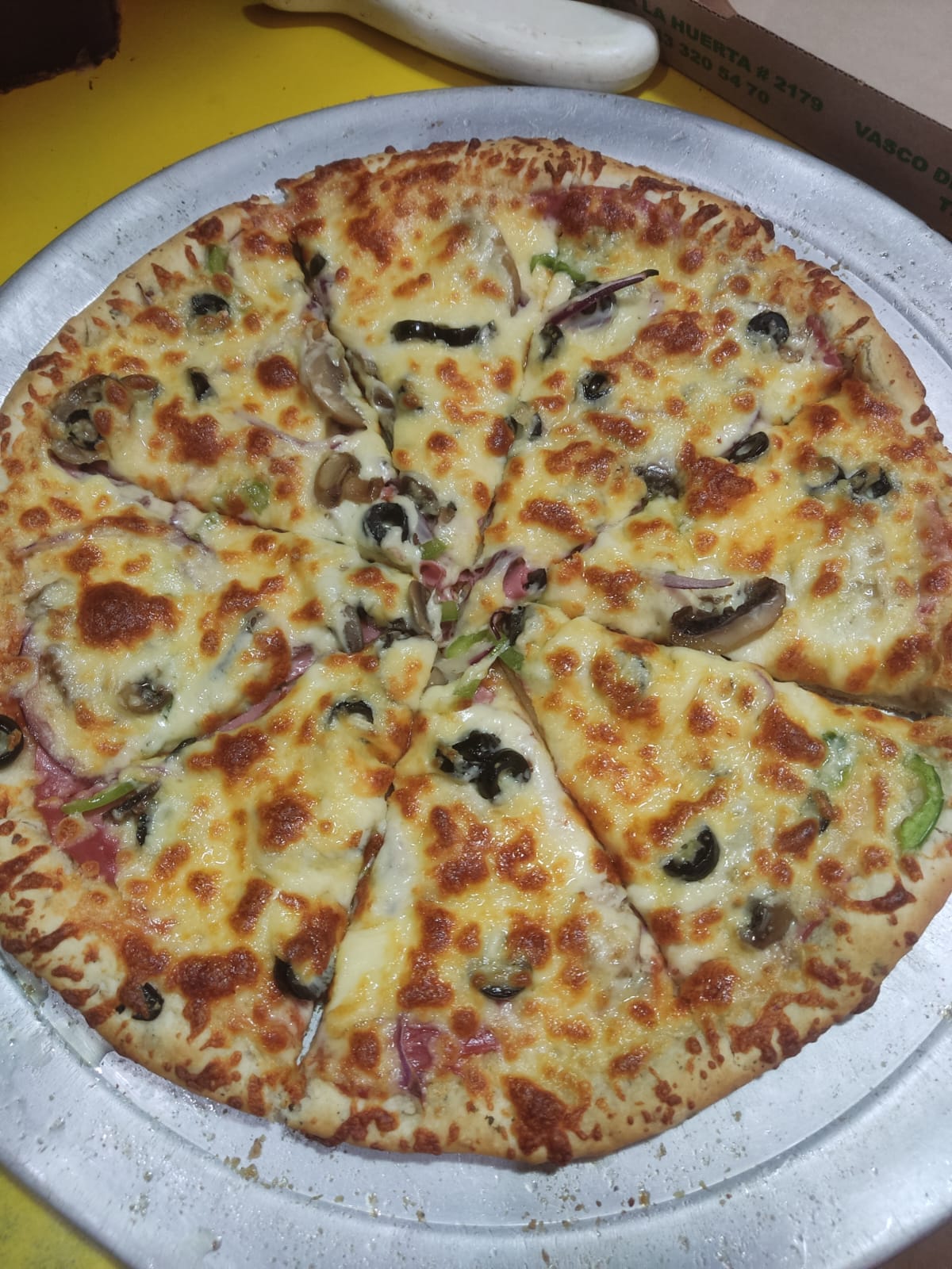 Salami, champiñones, pimiento, cebolla y aceitunas.