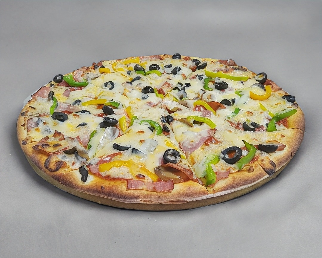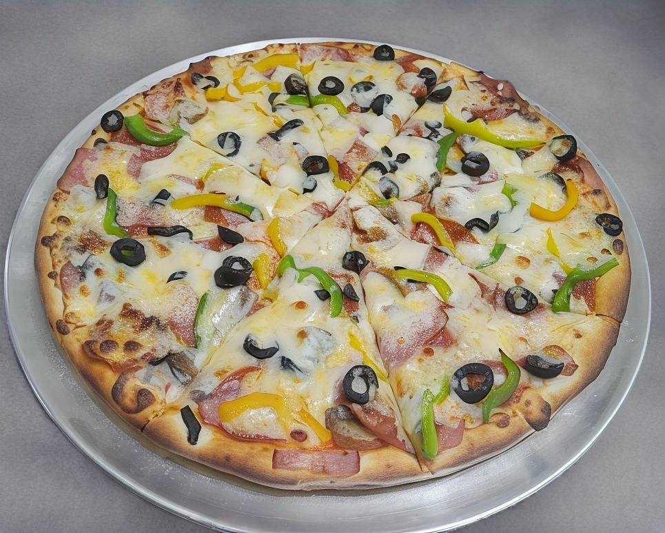 Peperoni, champiñon, aceitunas negras, tocino y pimiento morrón