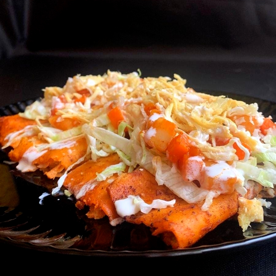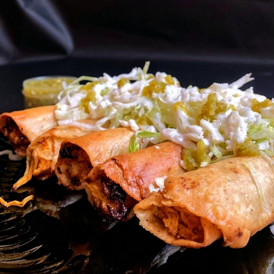 Disfruta de tu orden de 4 tacos dorados rellenas del guisado de tu preferencia, con lechuga, queso y crema encima