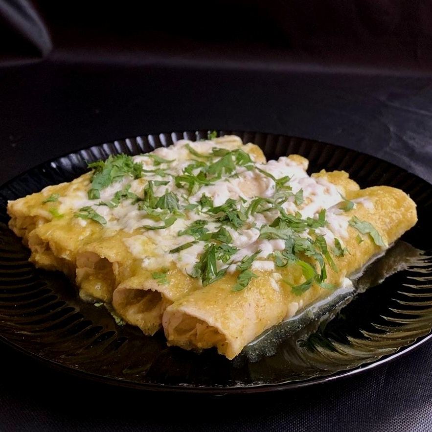 Exquisitas Enchiladas Suizas de 4pz bañadas de salsa verde y rellenas con guisado de tu elección, con crema, queso, cilantro y cebolla arriba.