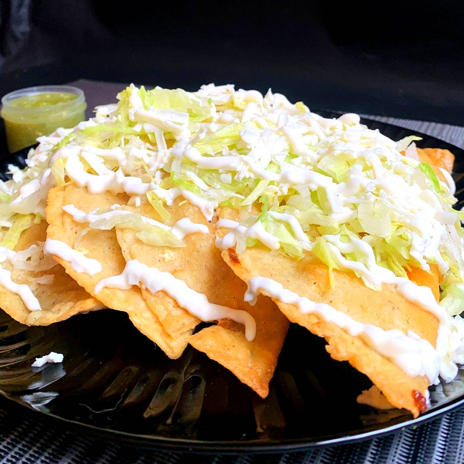 Disfruta de una orden de Quesadillas Fritas al estilo La Suegris!, con lechuga, crema y queso encima.