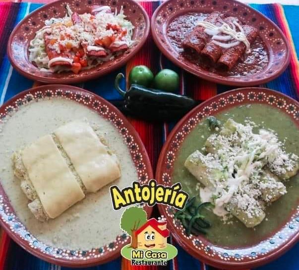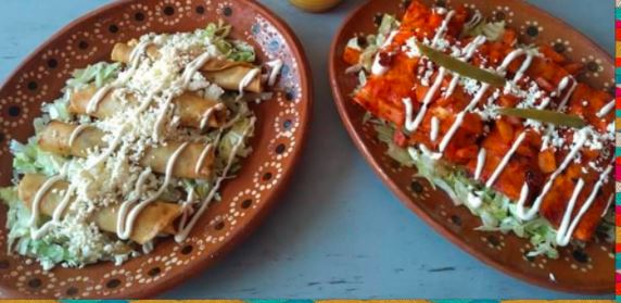 4 deliciosas enchiladas rellenas de cebolla con queso, acompañadas con papa y zanahoria guisada, lechuga, crema, queso ranchero y rajas de chile jalapeño, ¡las tradicionales en morelia!.