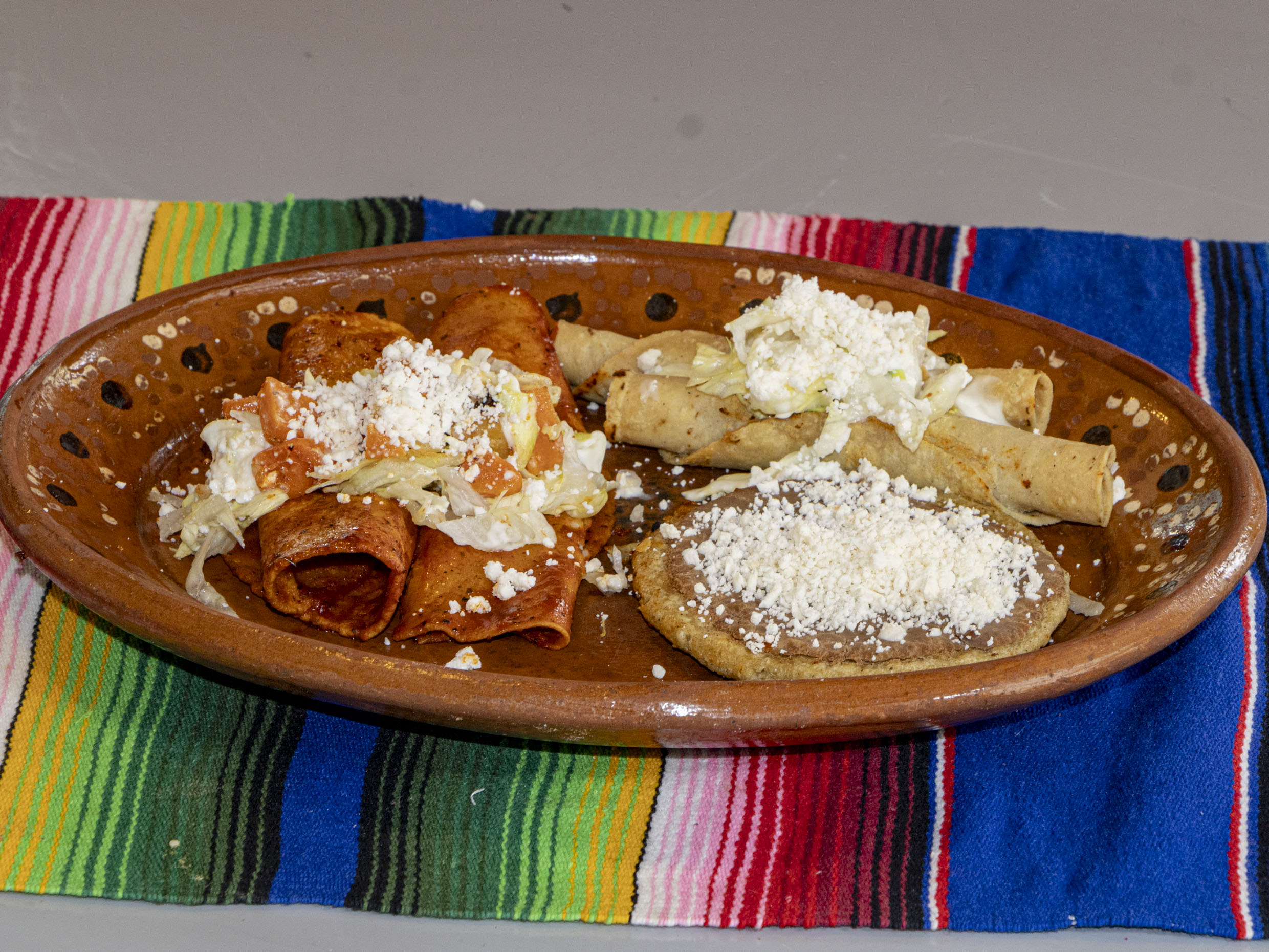 Una deliciosa combinación de 2 flautas del guiso disponible, 1 sope sencillo y 2 enchiladas sencillas (rellenas de queso y cebolla, acompañadas con papa, zanahoria, lechuga, crema y rajas de jalapeño). Acompáñalo con tu refresco preferido o aguas de sabor.