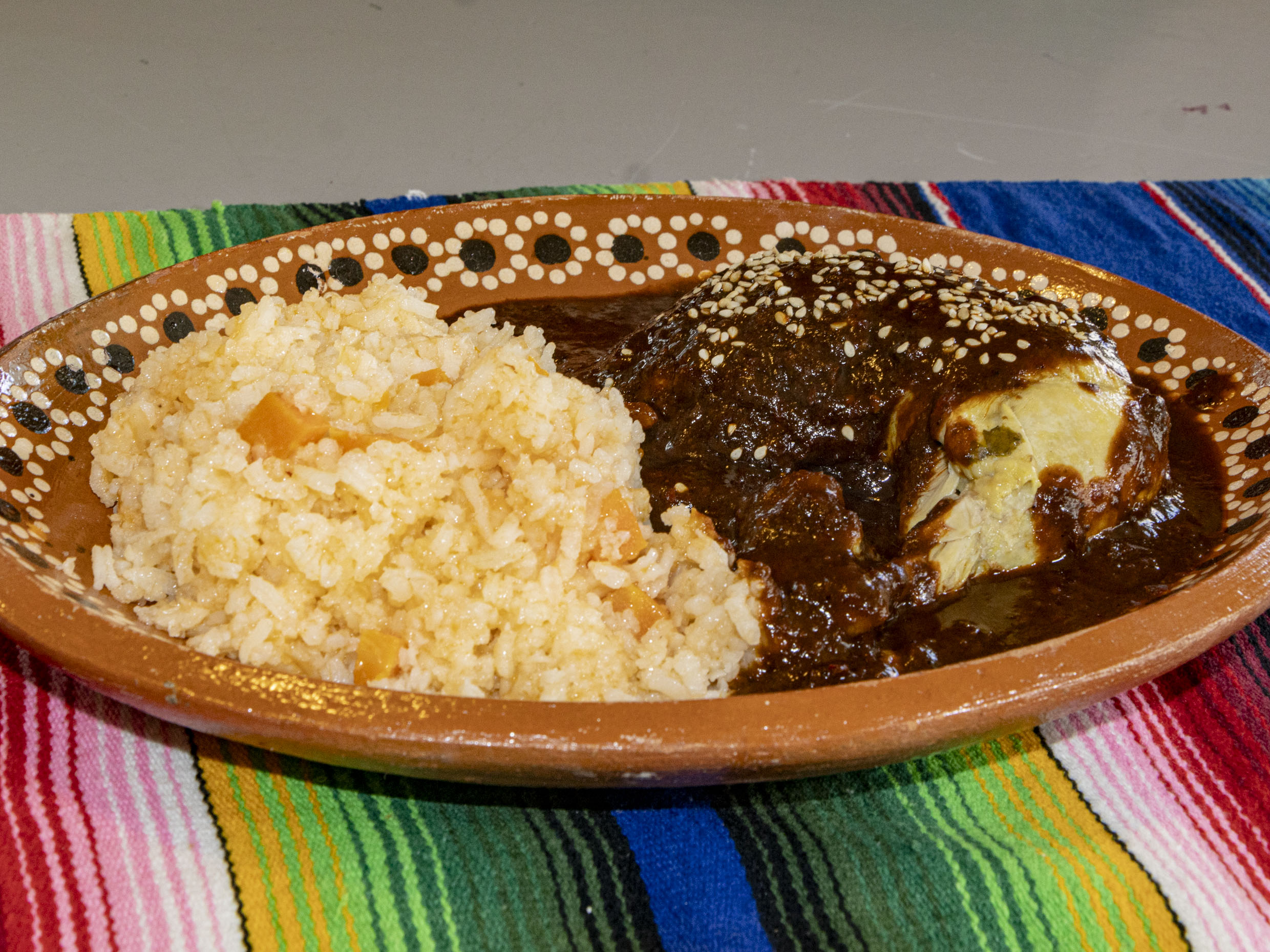 Delicioso mole poblano con arroz, y pierna y muslo de pollo, acompañado con tortillas hechas a mano.