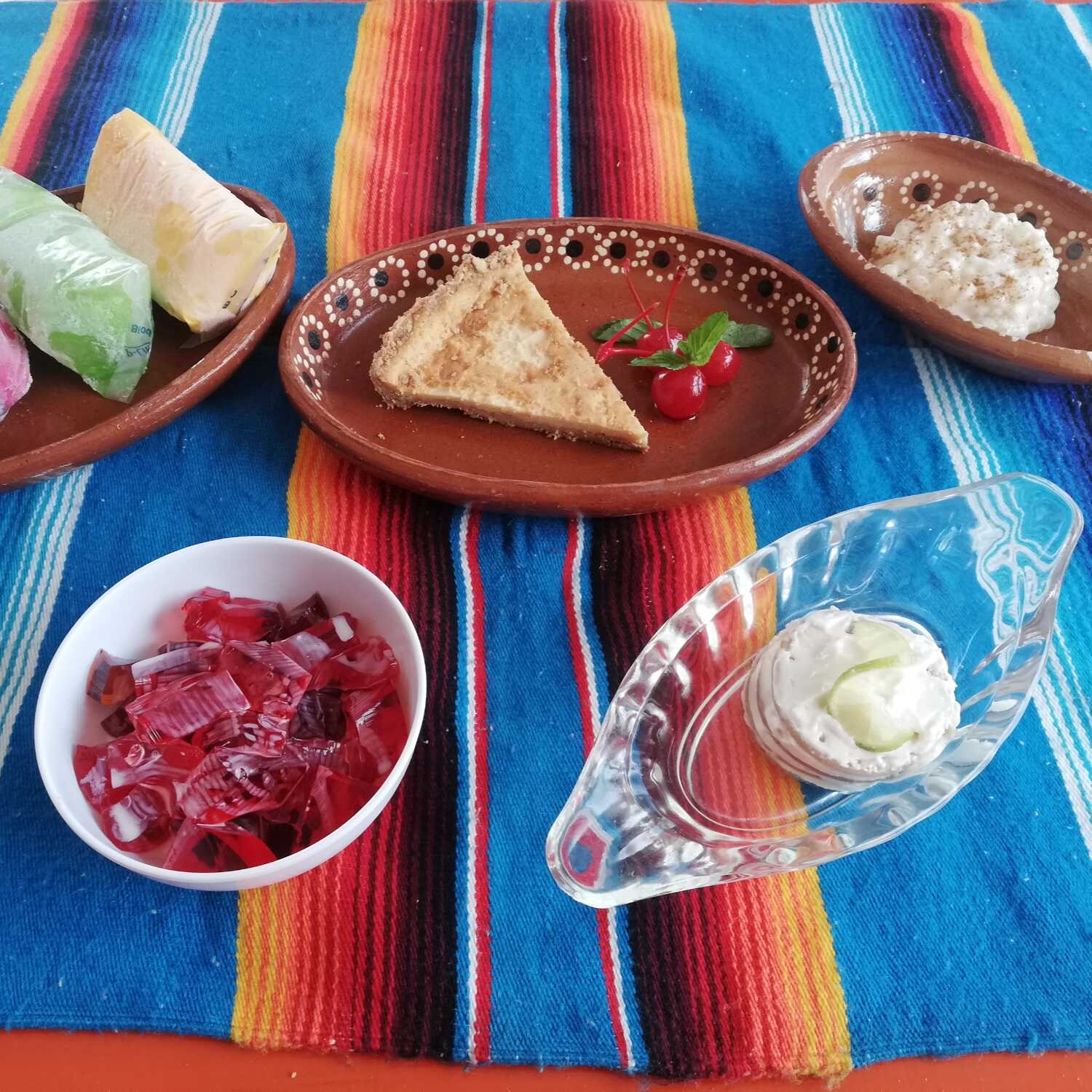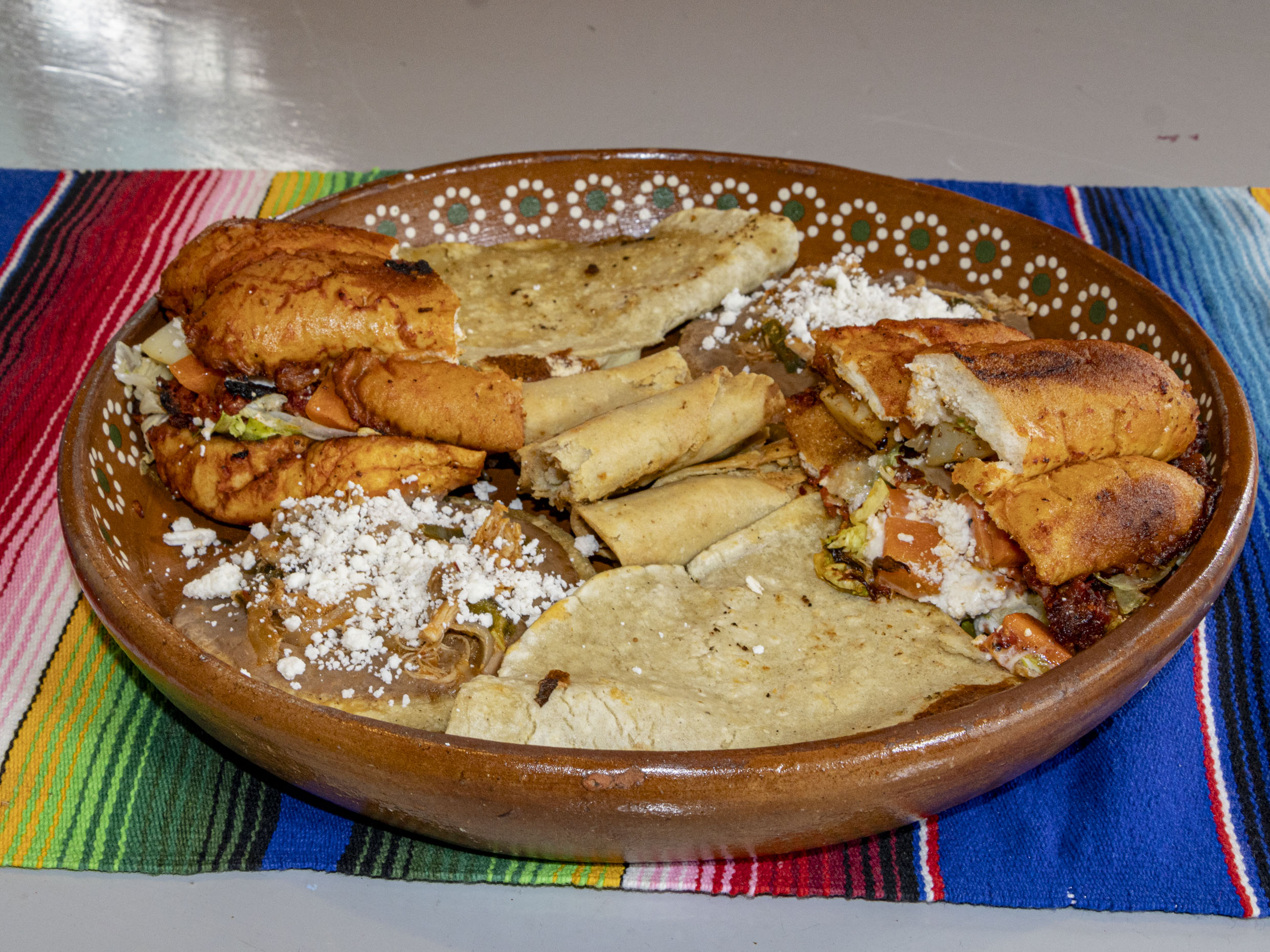 Para que compartas con tu pareja o amigo(a), 2 mitades de pambazo, 2 mitades de quesadilla con guisado, 4 mitades de flautas del guiso disponible y 2 sopes de guisado. Si prefieres no compartirlo, no le diremos a nadie.