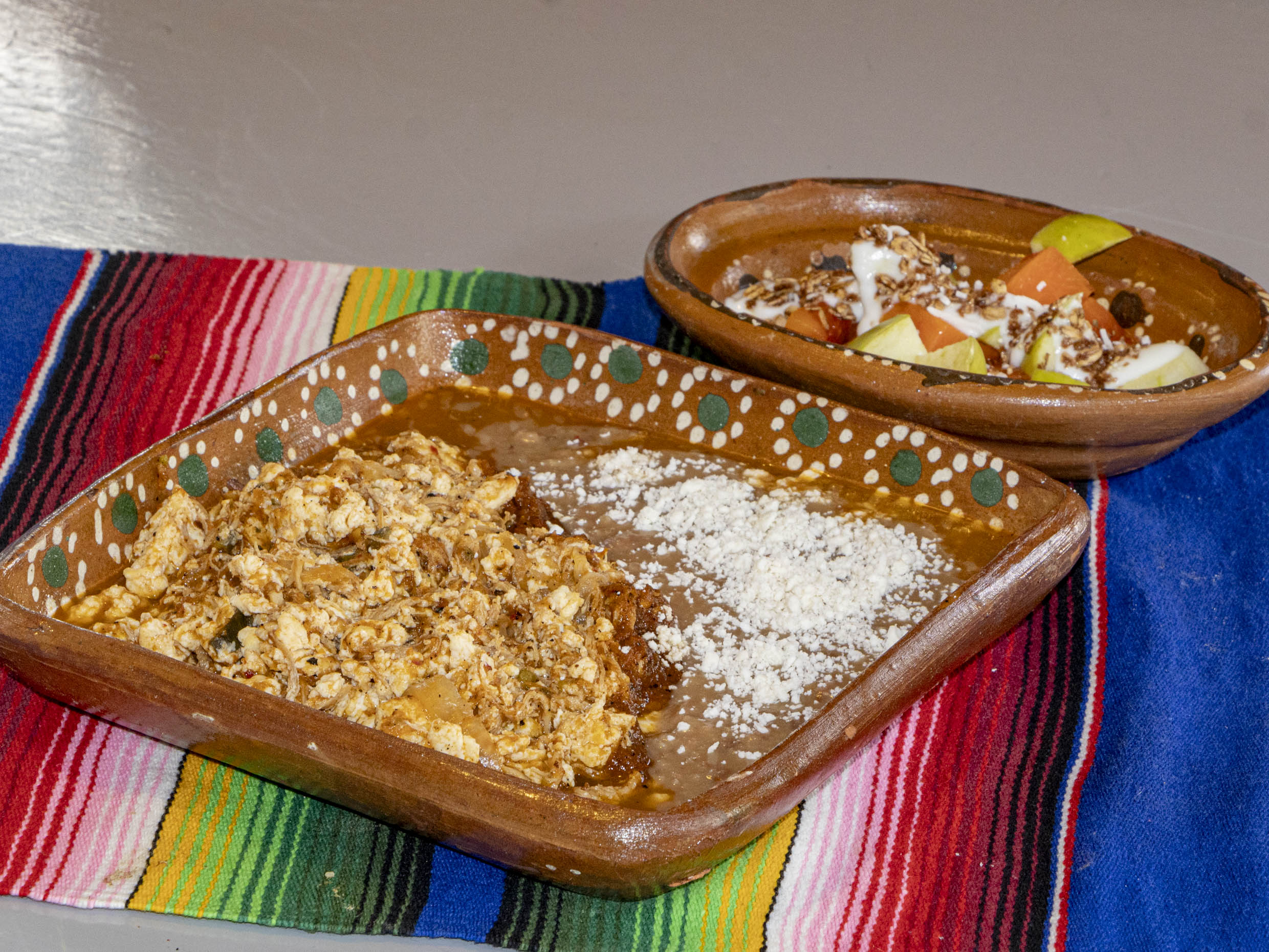 Disfruta 2 huevos revueltos o estrellados, preparados con el guiso de tu preferencia, acompañados con frijoles y tortillas hechas a mano.