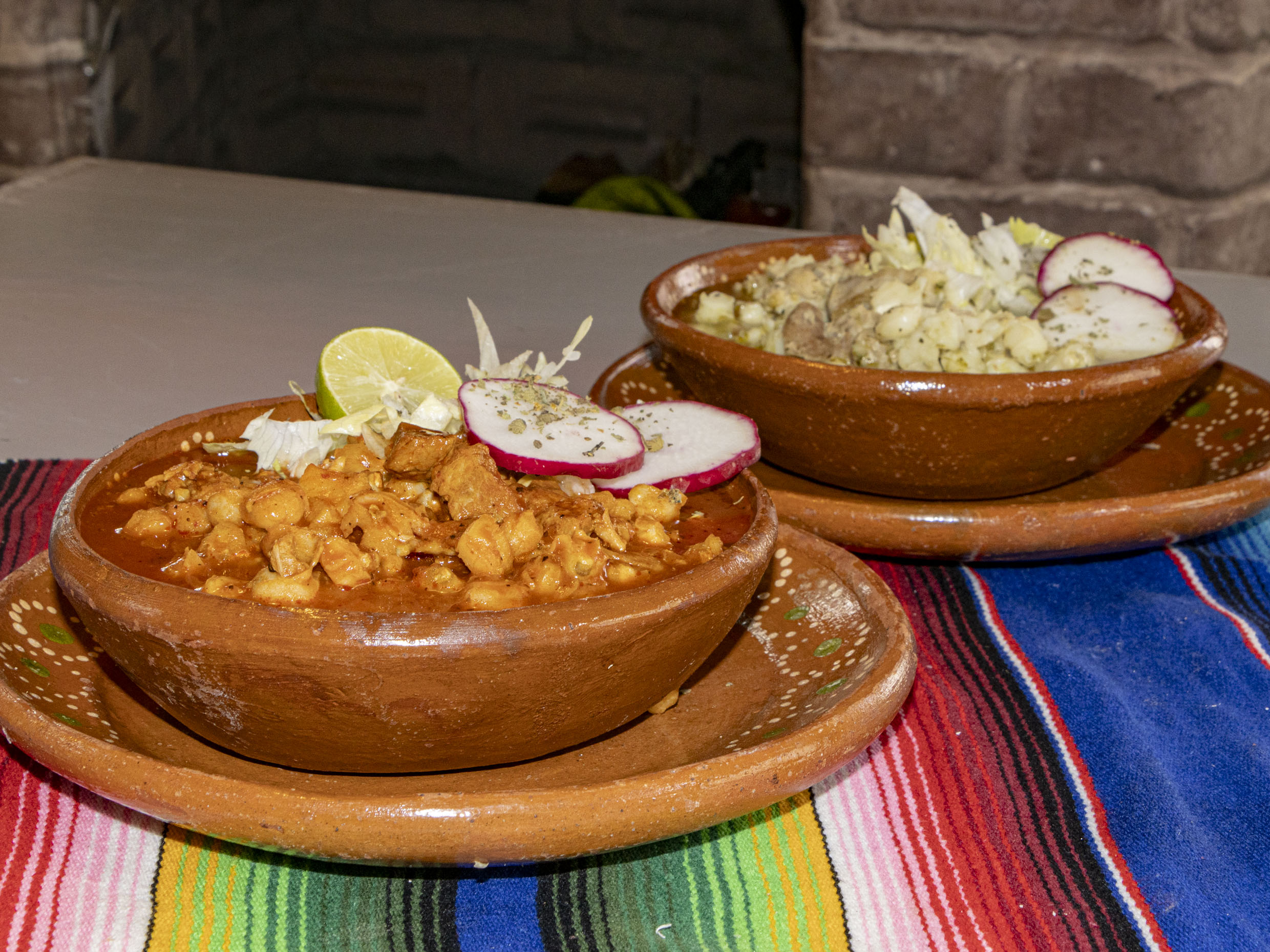 Exquisito pozole con carne de cerdo, servido con lechuga, cebolla y limón, acompañado con unos crujientes totopos caseros., salsa a escoger.