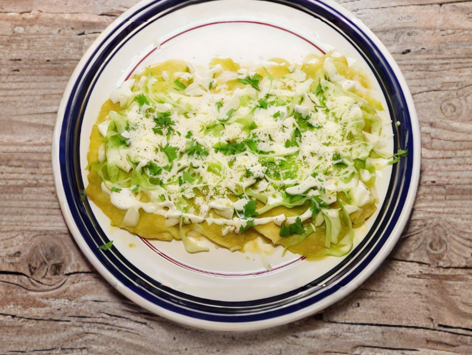 Tortilla frita, pollo desebrado, salsa verde un poco dulce, crema y queso.