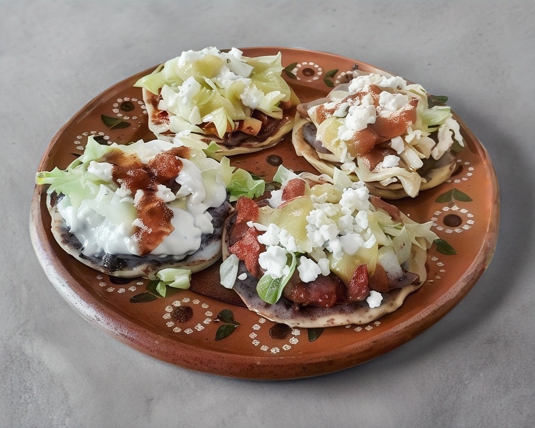5 Tortillas bañada en salsa roja rellenas con diferentes guisados,ensalada de papa y zanahoria,lechuga,crema y queso