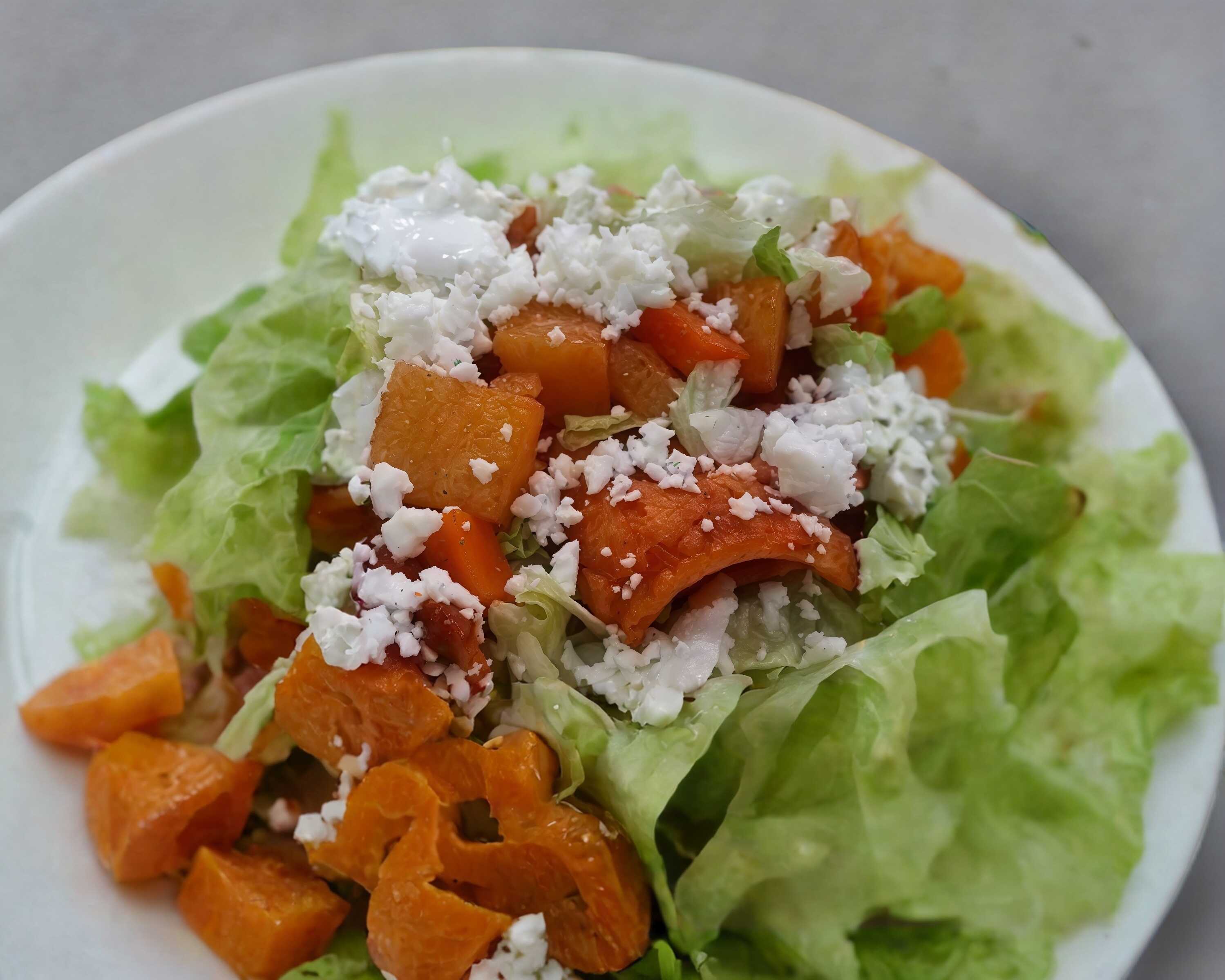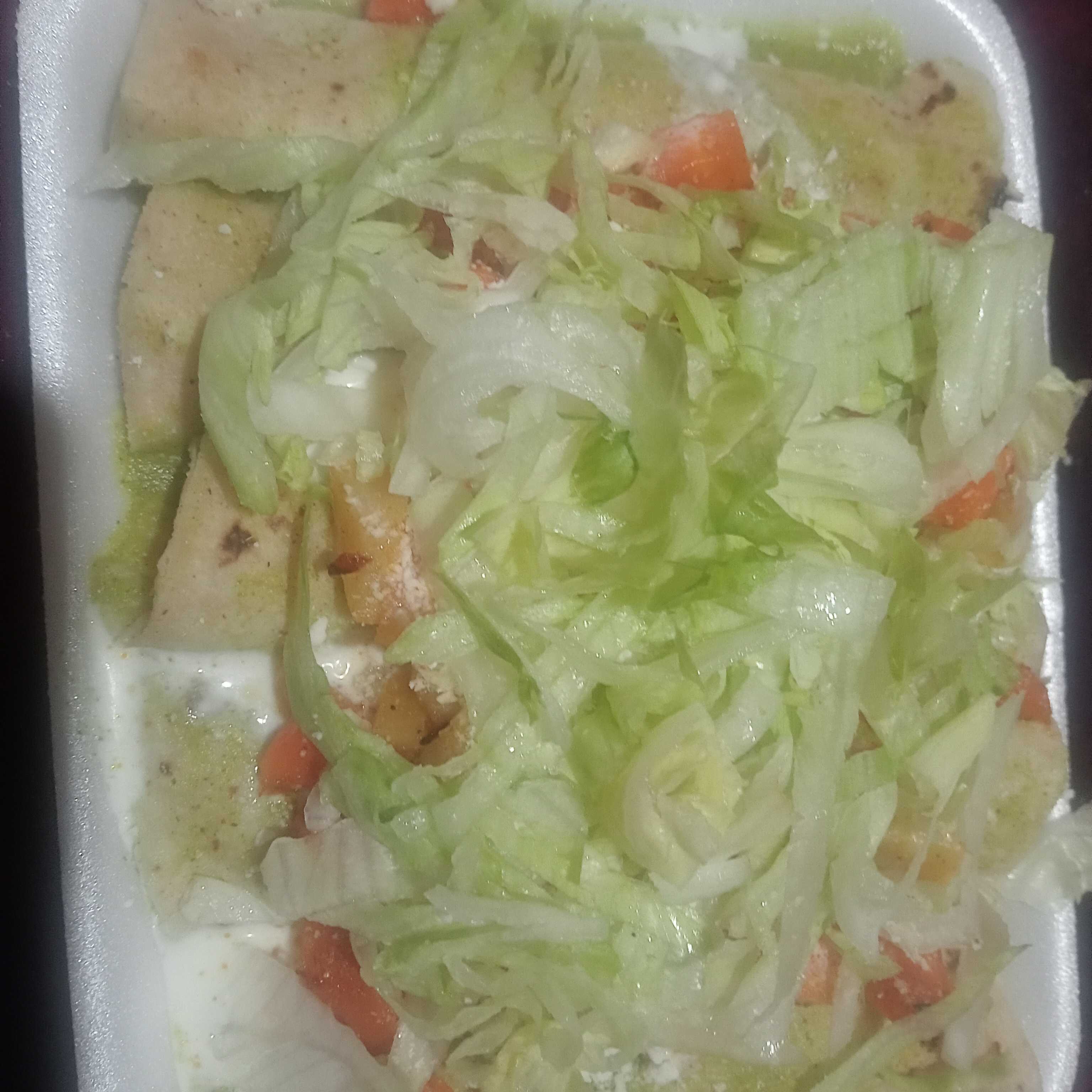 5 Tortillas bañada en salsa roja,ensalada de papa y zanahoria,lechuga,crema y queso