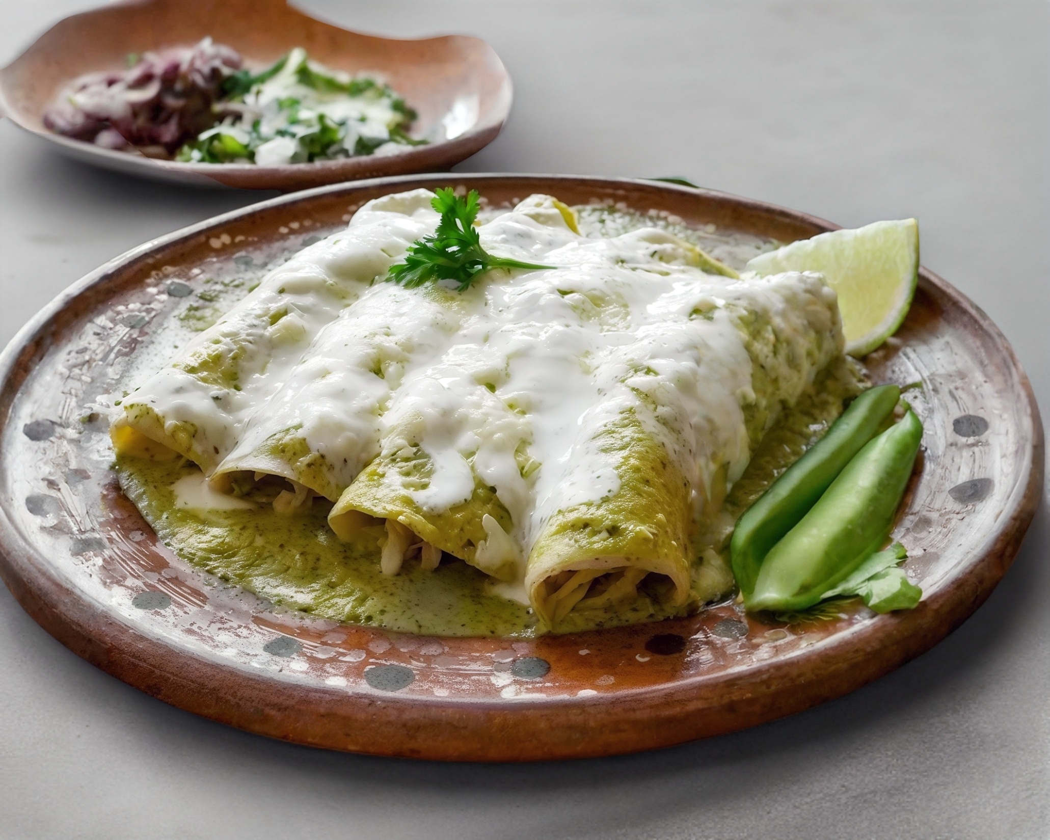 5 tortillas rellenas de queso ranchero y cebollita picada bañadas en salsa verde con queso derretido y crema