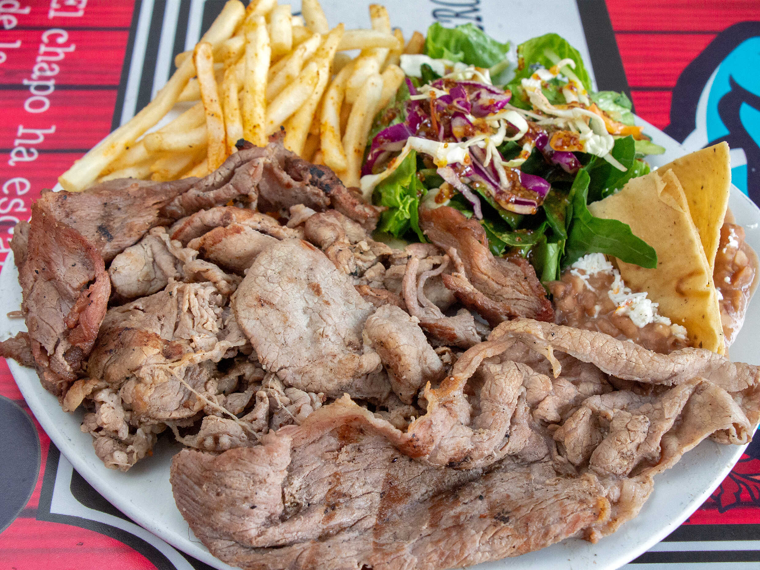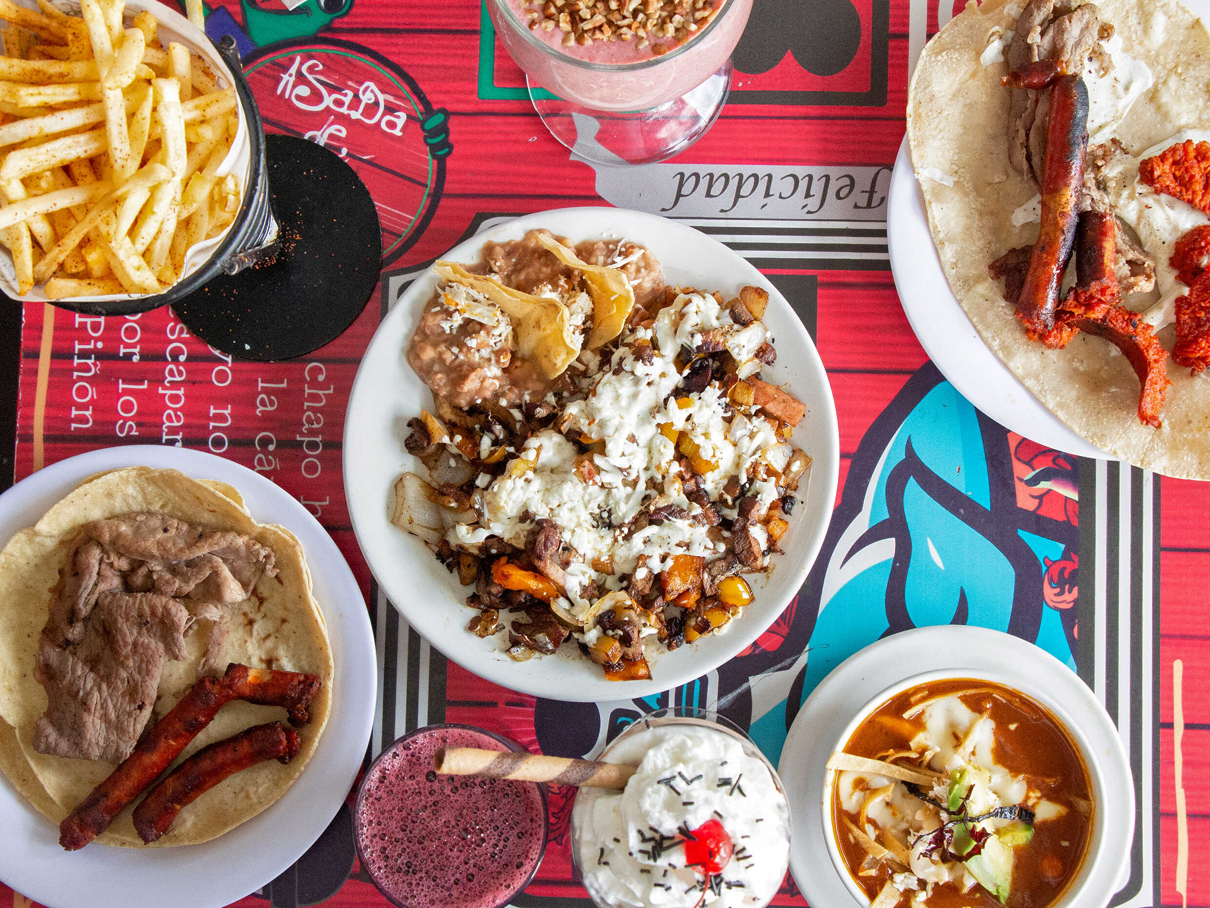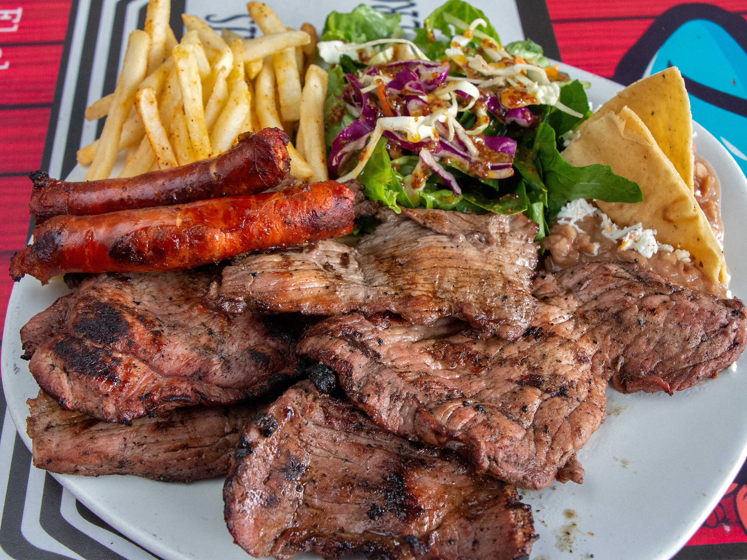 Arrachera, chistorra y queso.