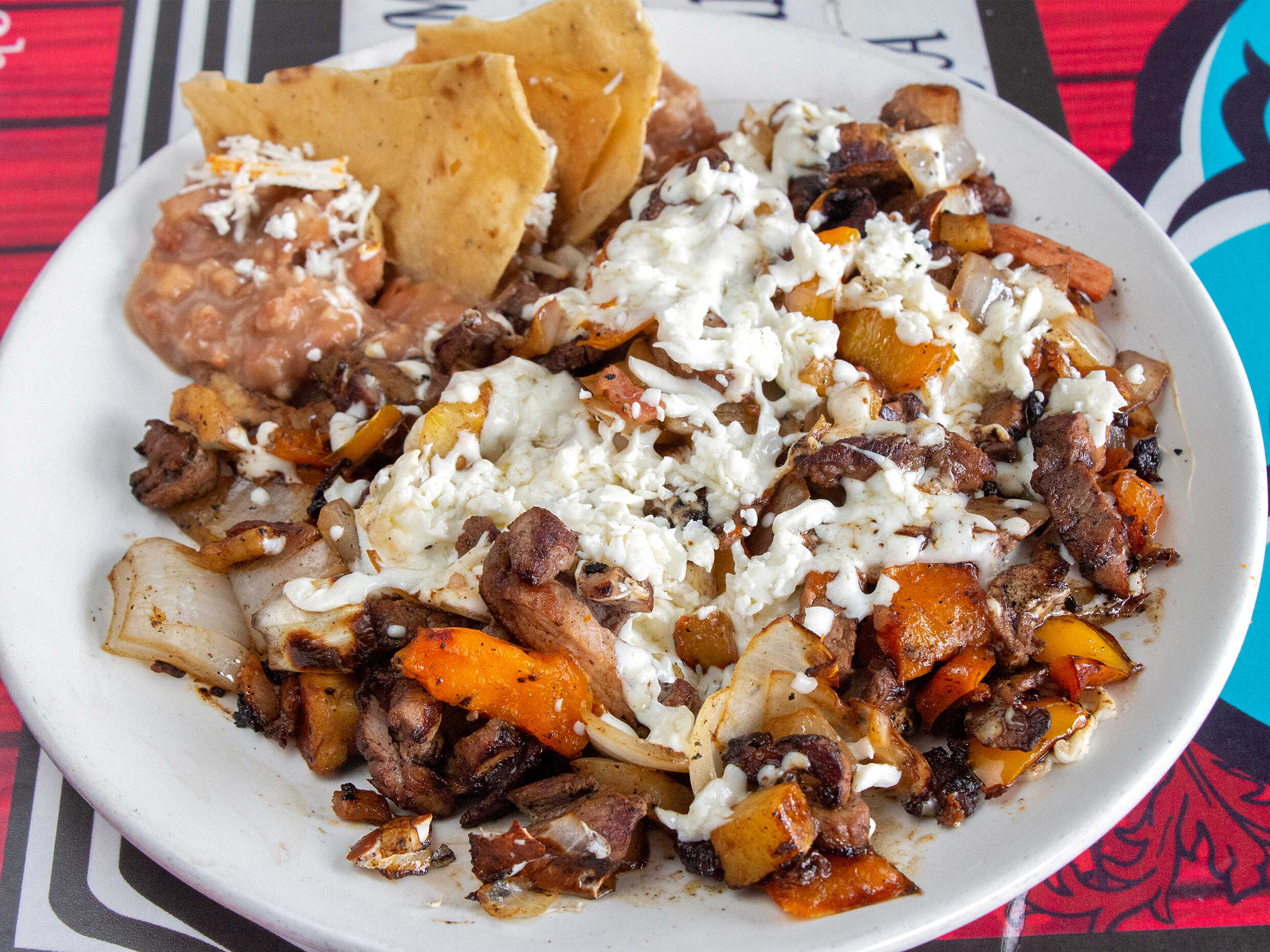 Tocino, carne, cebolla, morrón, piña, queso oaxaca, frijoles y totopos.