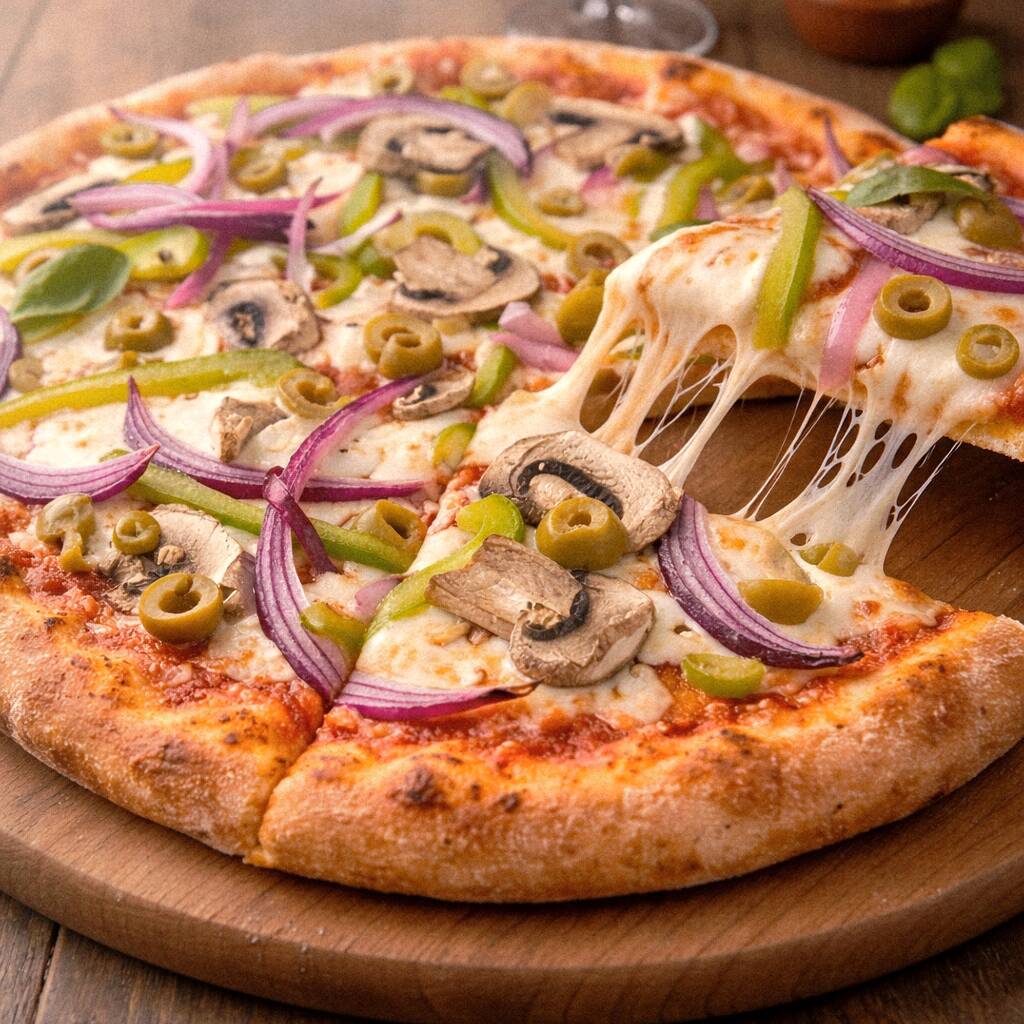Champiñones rebanados, cebolla morada, pimiento morron crujiente y aceitunas(Pizza de 30cm)