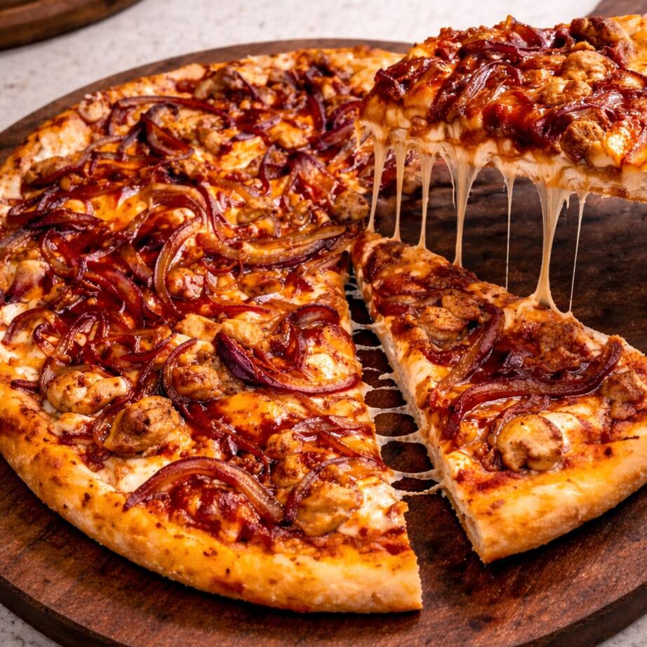 Pollo en cubos, cebolla morada caramelizada y salsa BBQ (Pizza de 30cm)