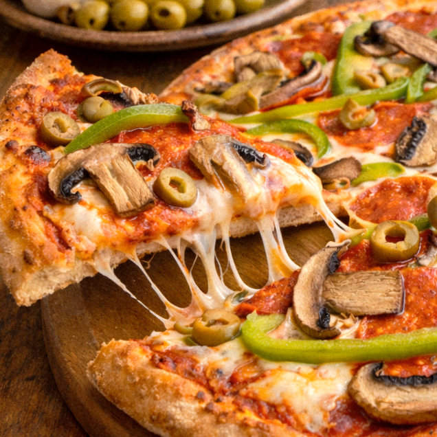 Pepperoni, pimiento morron crujiente, champiñones y aceitunas(Pizza de 30cm)