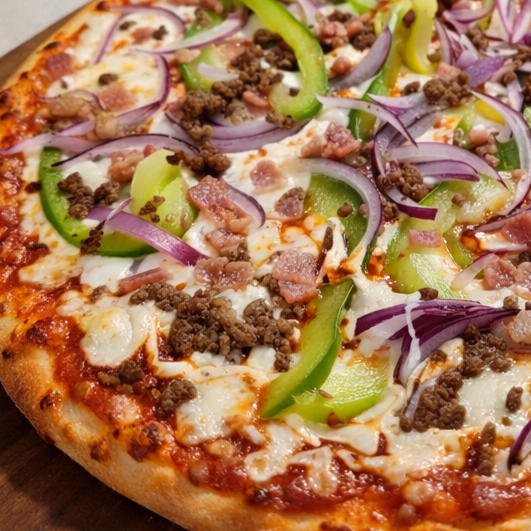 Carne molida, tocino, cebolla morada y pimiento morron (Pizza de 30cm)
