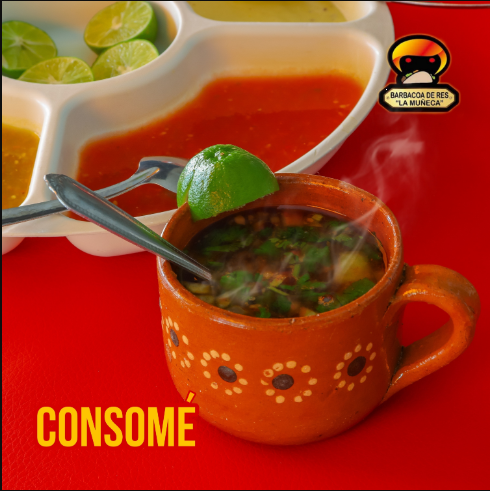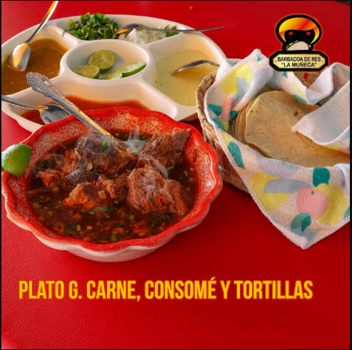 Plato con carne, consomé y tortillas, verduras, salsa y limon.