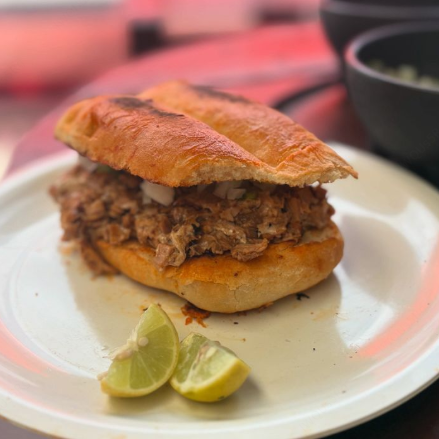 Rica torta con telera hecha a la leña, queso Oaxaca y carne de barbacoa