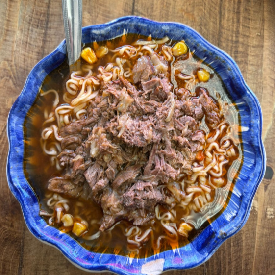 Sopa de fideos instantáneos cocinados con consomé y carne de barbacoa