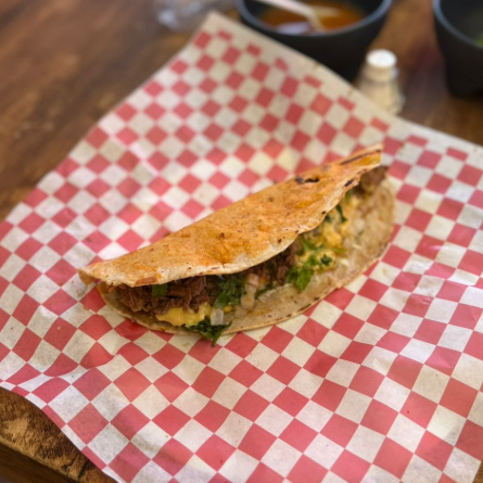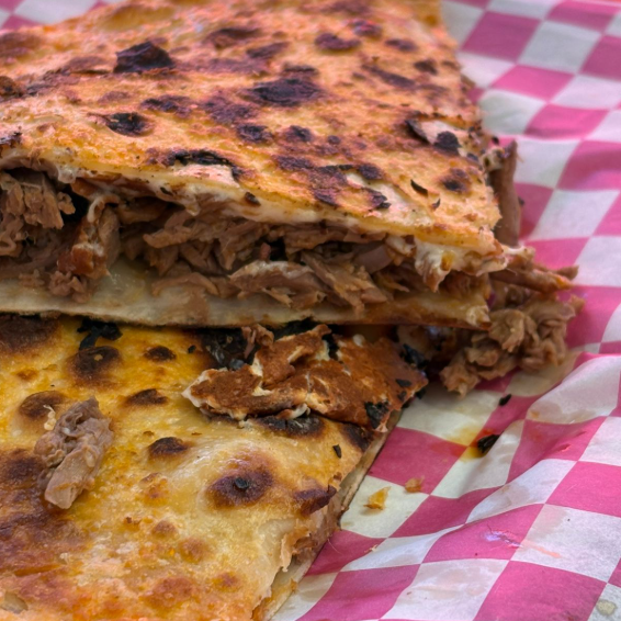 Rica sincronizada hecha con doble tortilla jumbo de harina, queso Oaxaca y barbacoa de res
