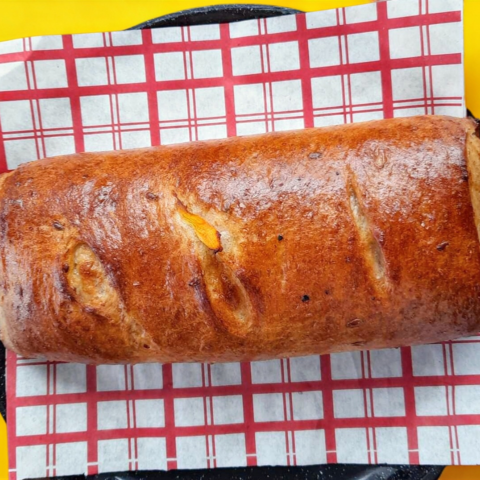 Tocino, elotito tierno, chile morrón y queso oaxaca.