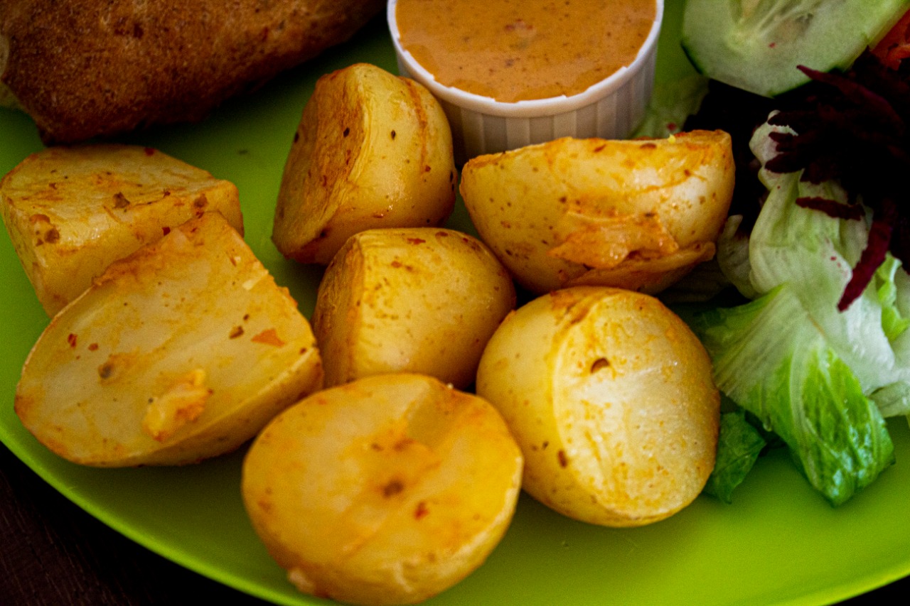 Papá en gajos con aderezo de chipotle.