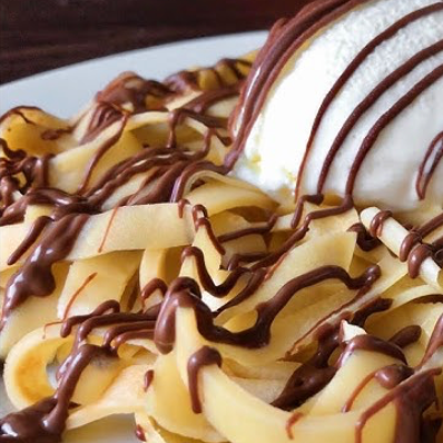 Crepa en cortes estilo fetuccini con fresa y crema batida y puedes fregar topping.