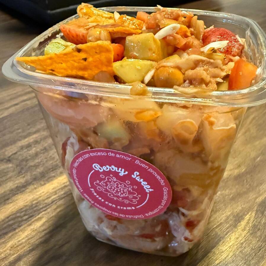 Doritos con repollo, cacahuates, jitomate, cueritos, fresa, mango, pepino, zanahoria, limón y salsas.