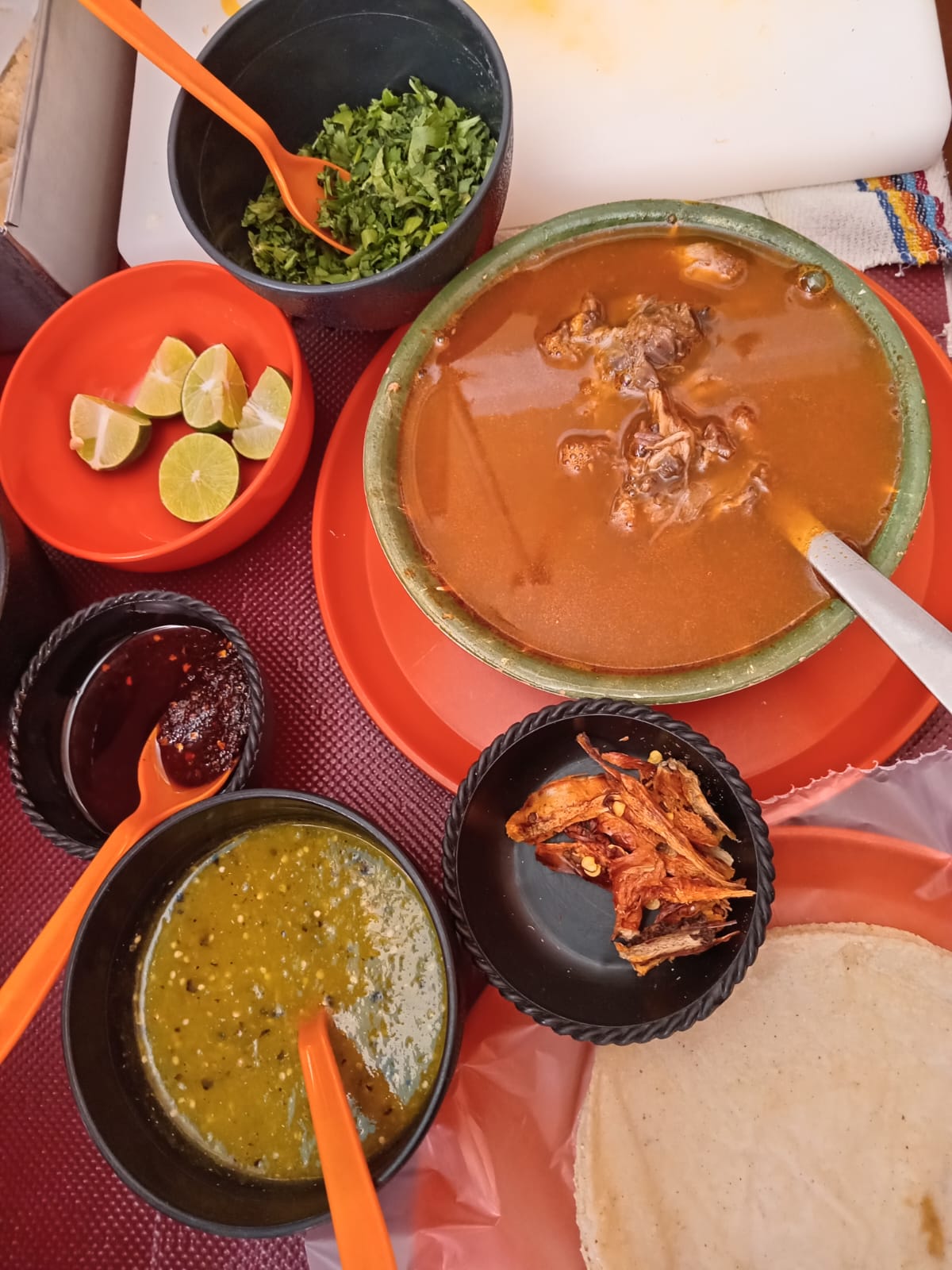 Maciza o surtido. Incluye consomé, tortillas, cebolla, cilantro, limones y salsa verde y/o roja.