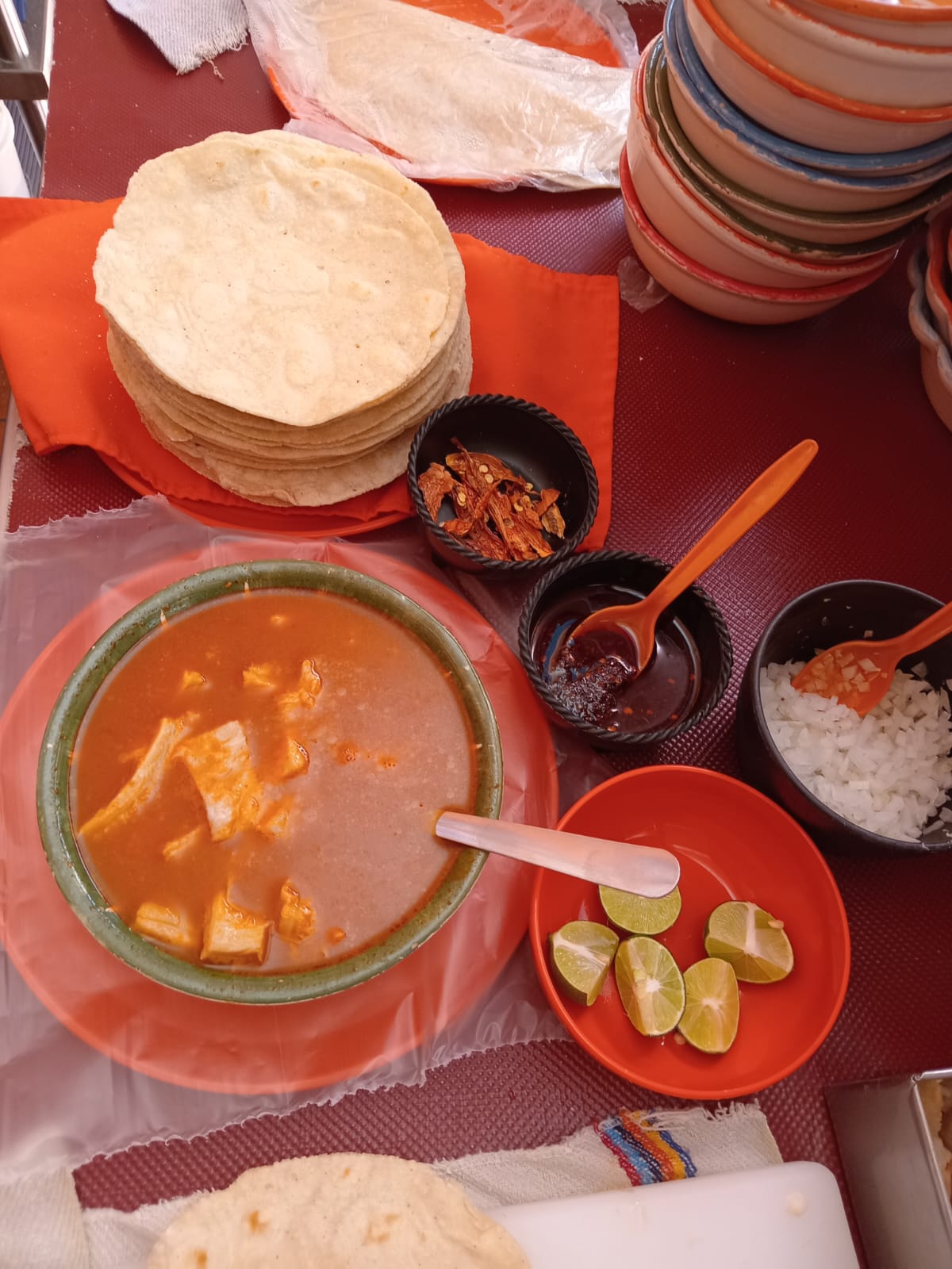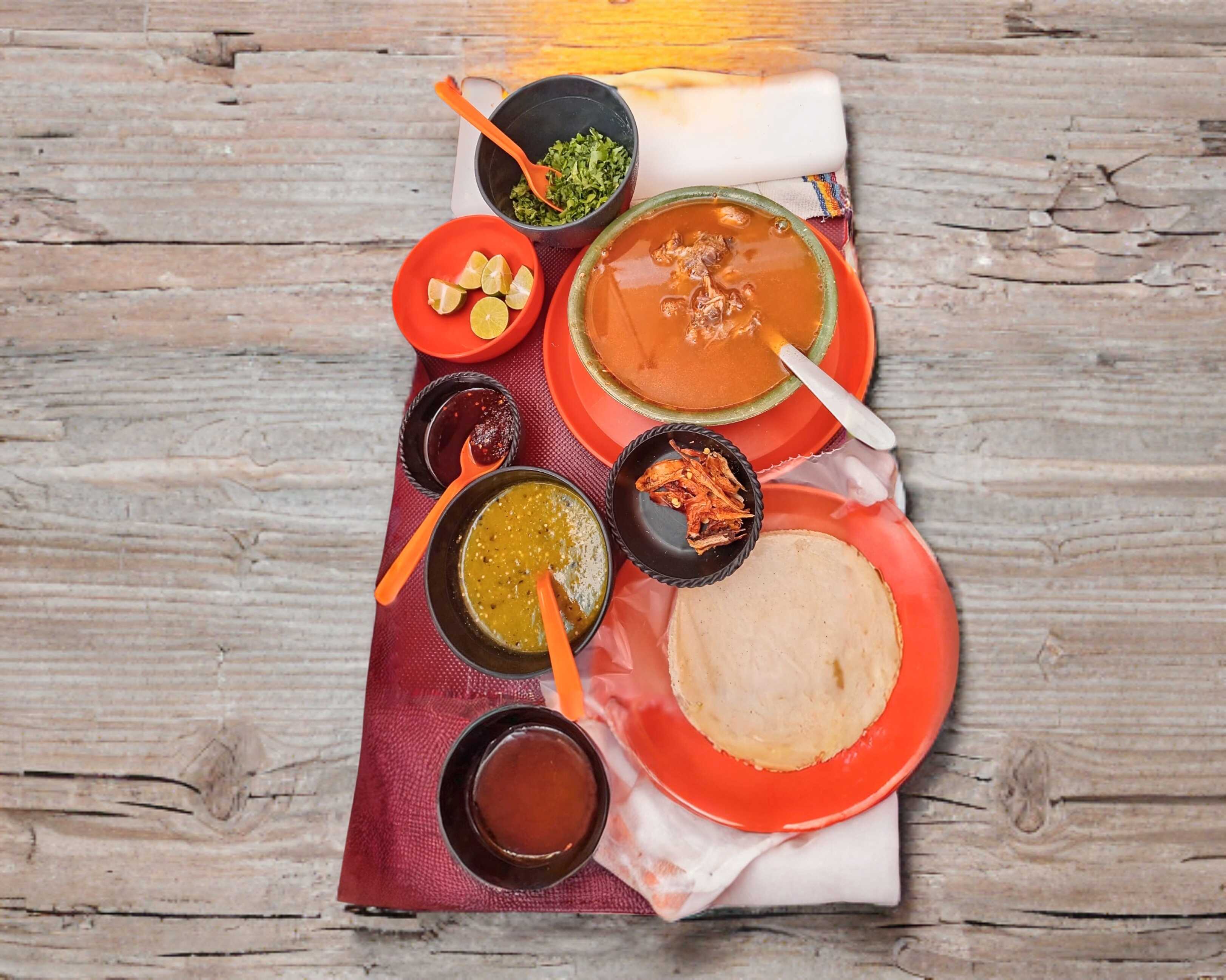 Pancita o surtido con consomé. Incluye tortillas hechas a mano, cebolla, cilantro, limones, salsa verde y/o roja.