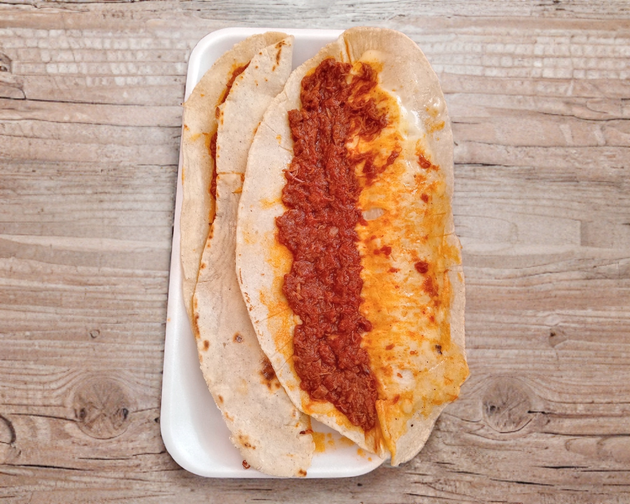 Quesadilla de maíz recién hecha a mano con nervio de birria y/o patita de res y queso oaxaca fundido. Verdura y salsa verde y/o roja aparte.