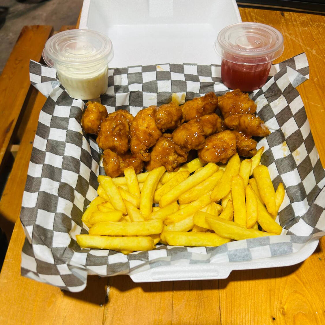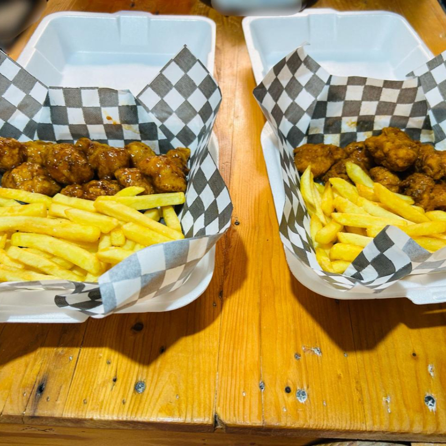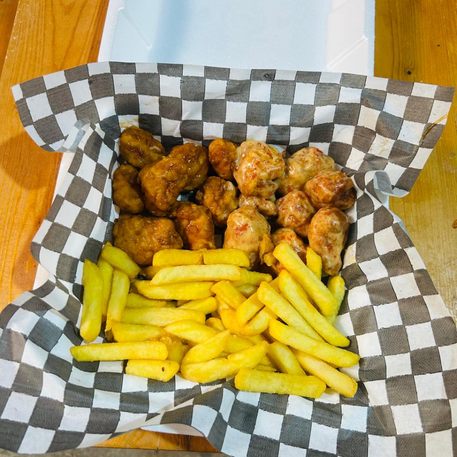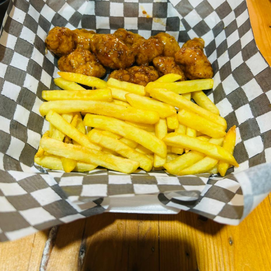 200g de boneless con salsa de su preferencia y 190g de papas con sal y paprika